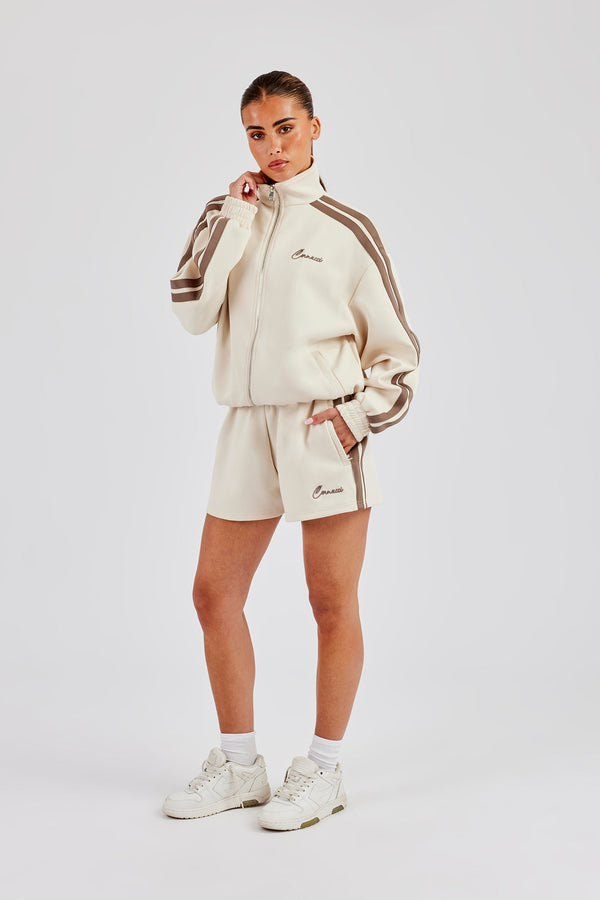 Funnel Neck Taupe Taping Zip Through Track Jacket & Wide Leg Pant - Off White