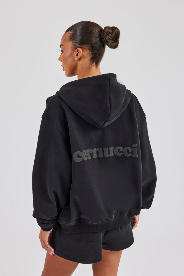 Oversized Zip Through Hoodie & Embroidered Wide Leg Jogger - Black