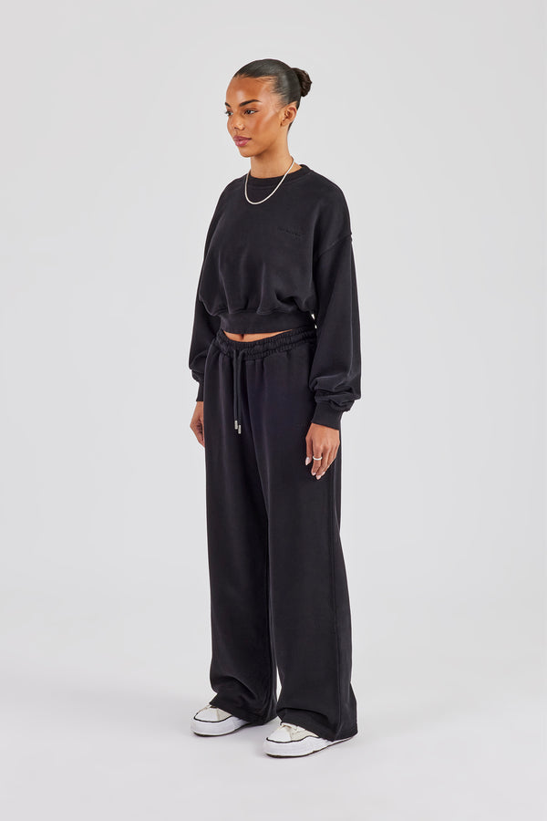 Womens Washed Boxy Fit Zip Through Hoodie & Wide Leg Jogger - Black