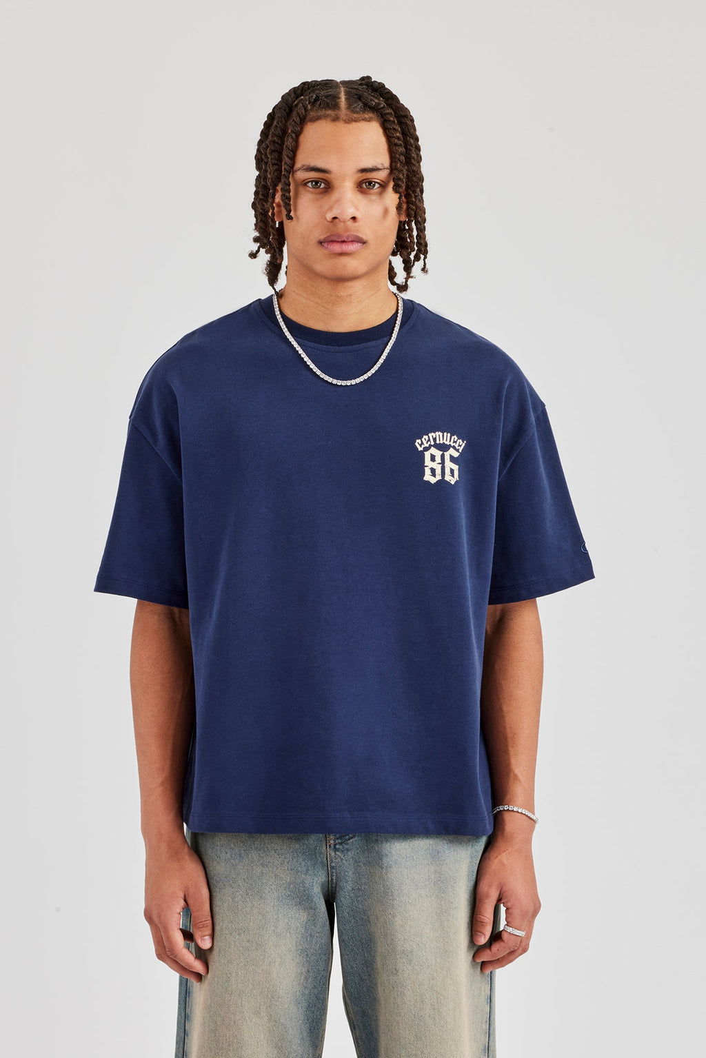 New t-shirt fits featuring our best selling oversized boxy fit, dropped shoulders and cropped body designed to sit on the waist. Navy short sleeve t-shirt featuring printed branding