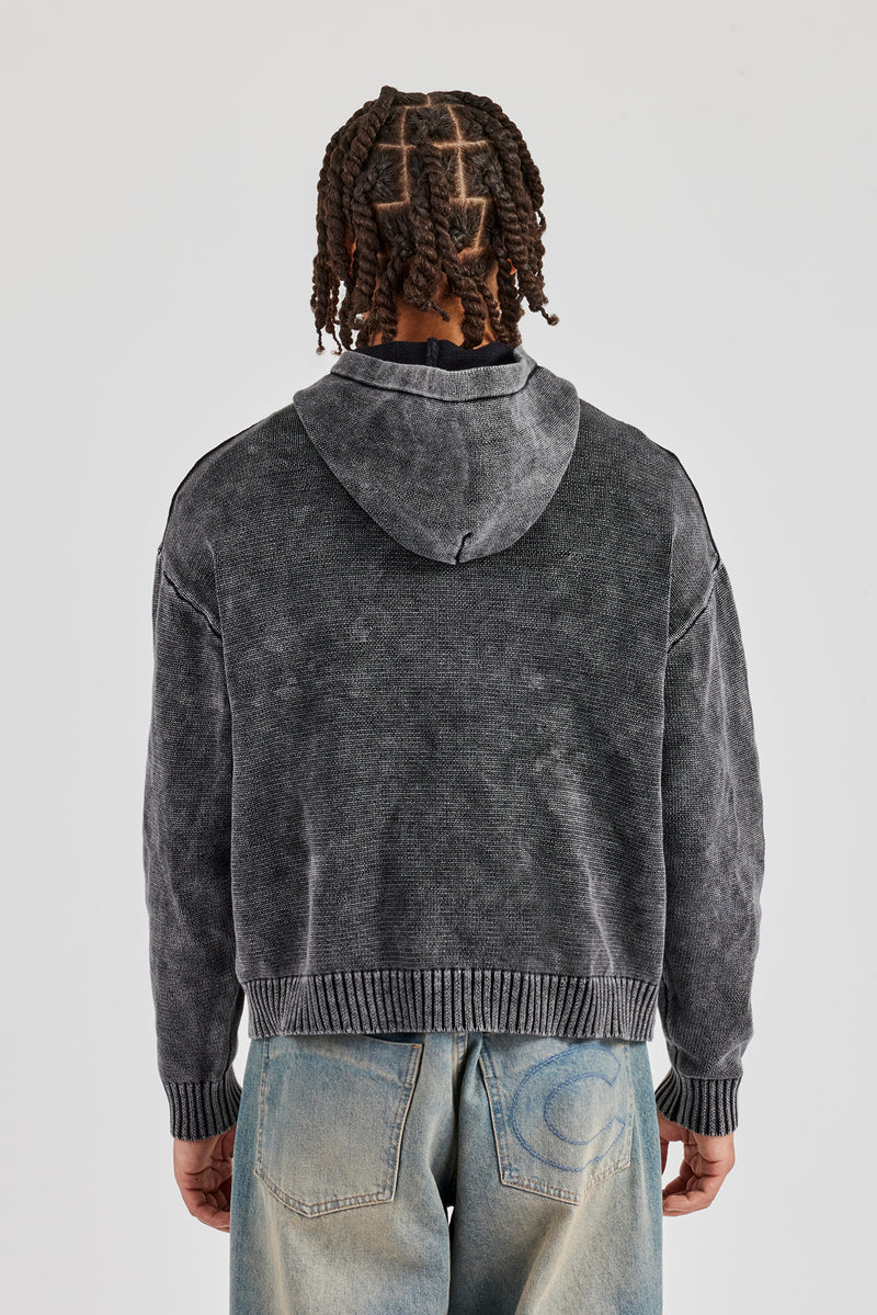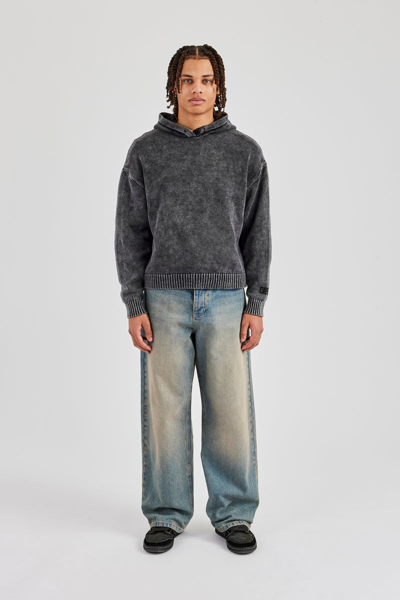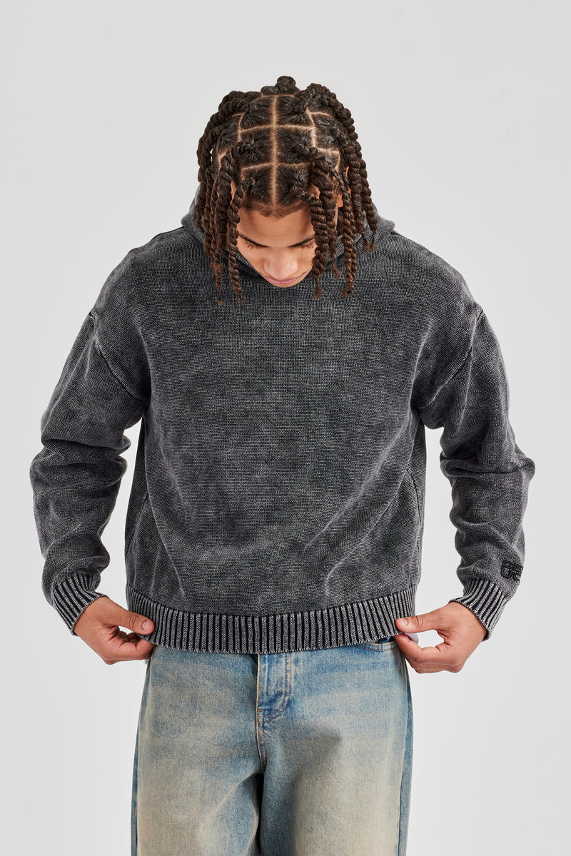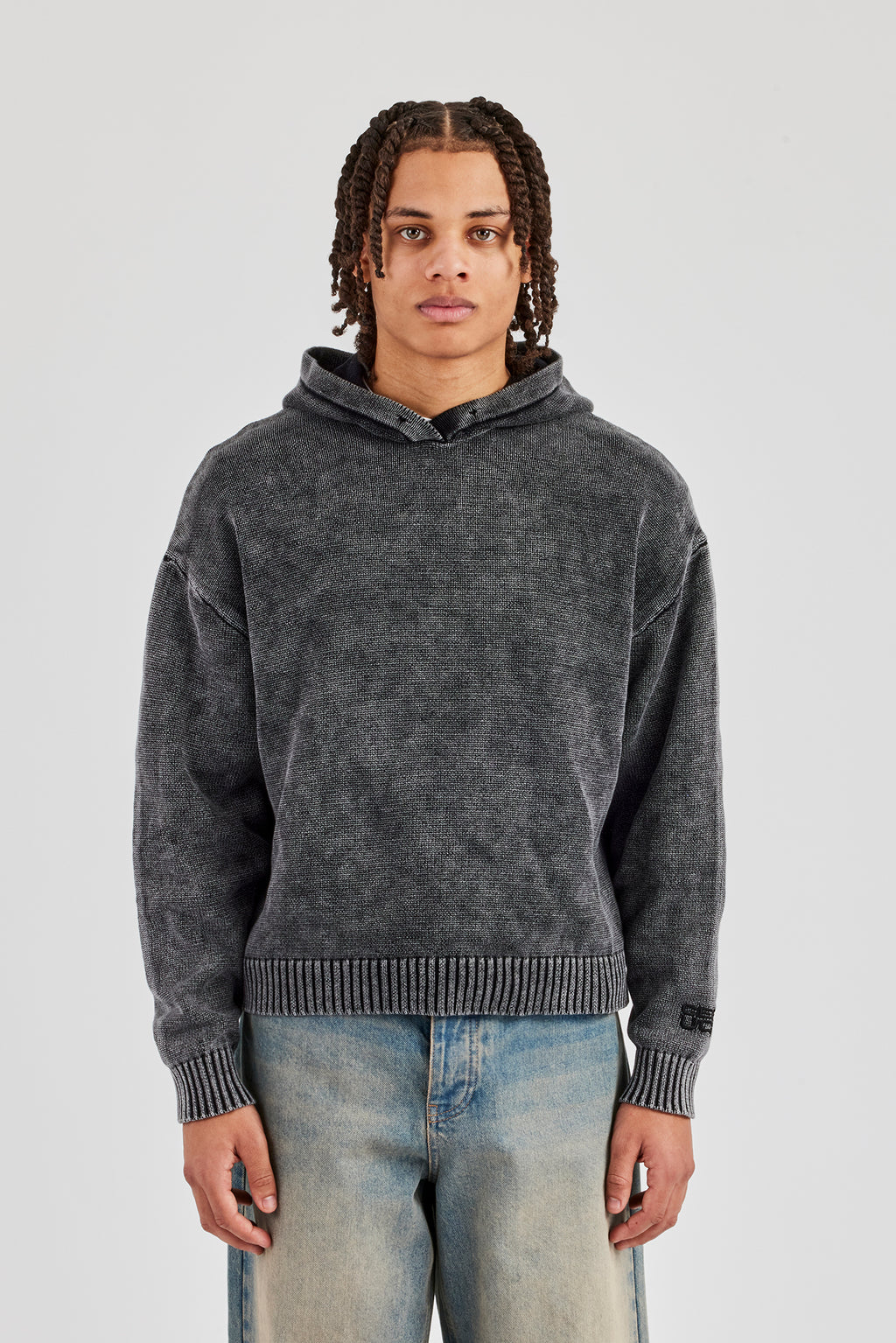 Charcoal acid wash knitted soft touch hoodie featuring tonal embroidery in a boxy fit.