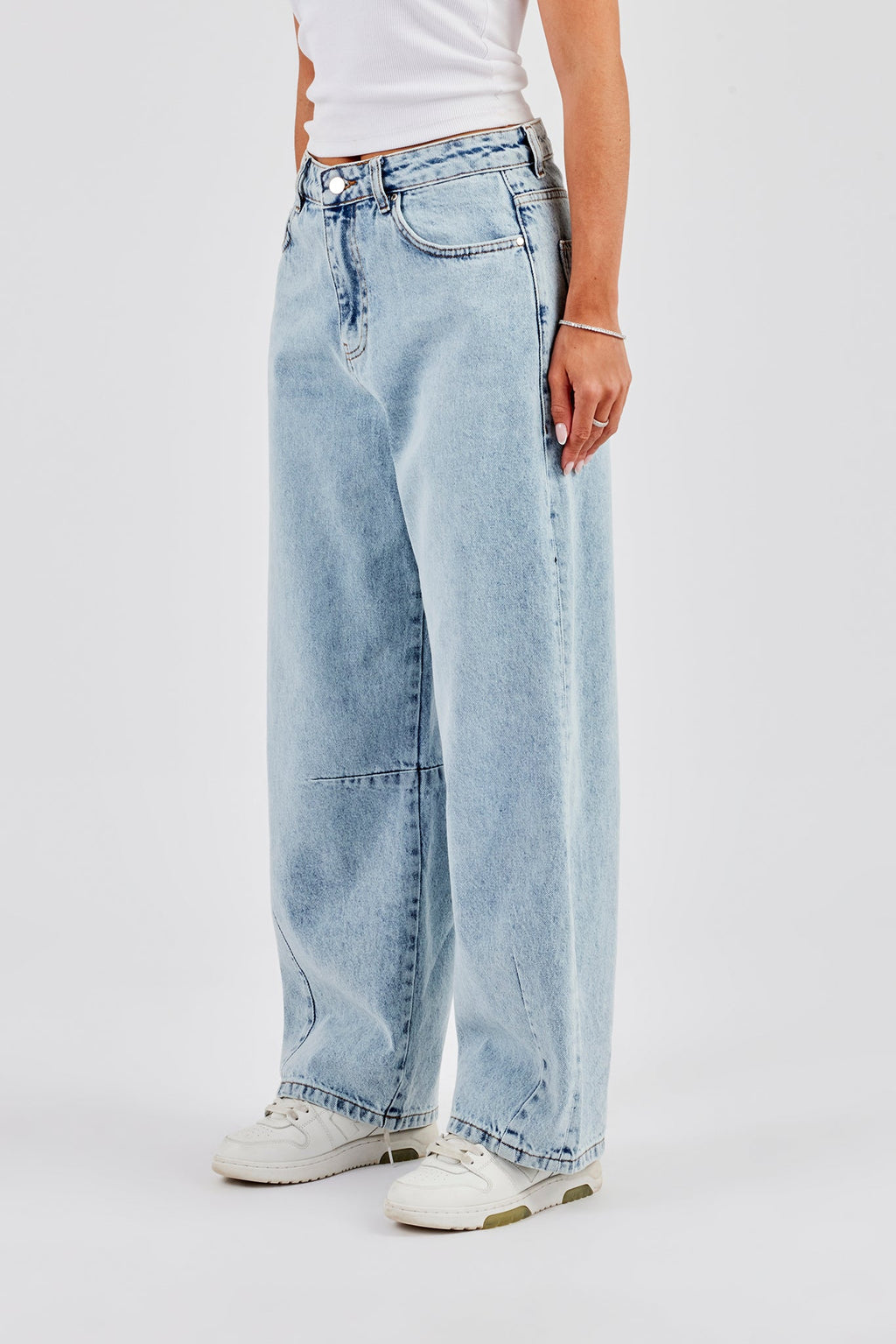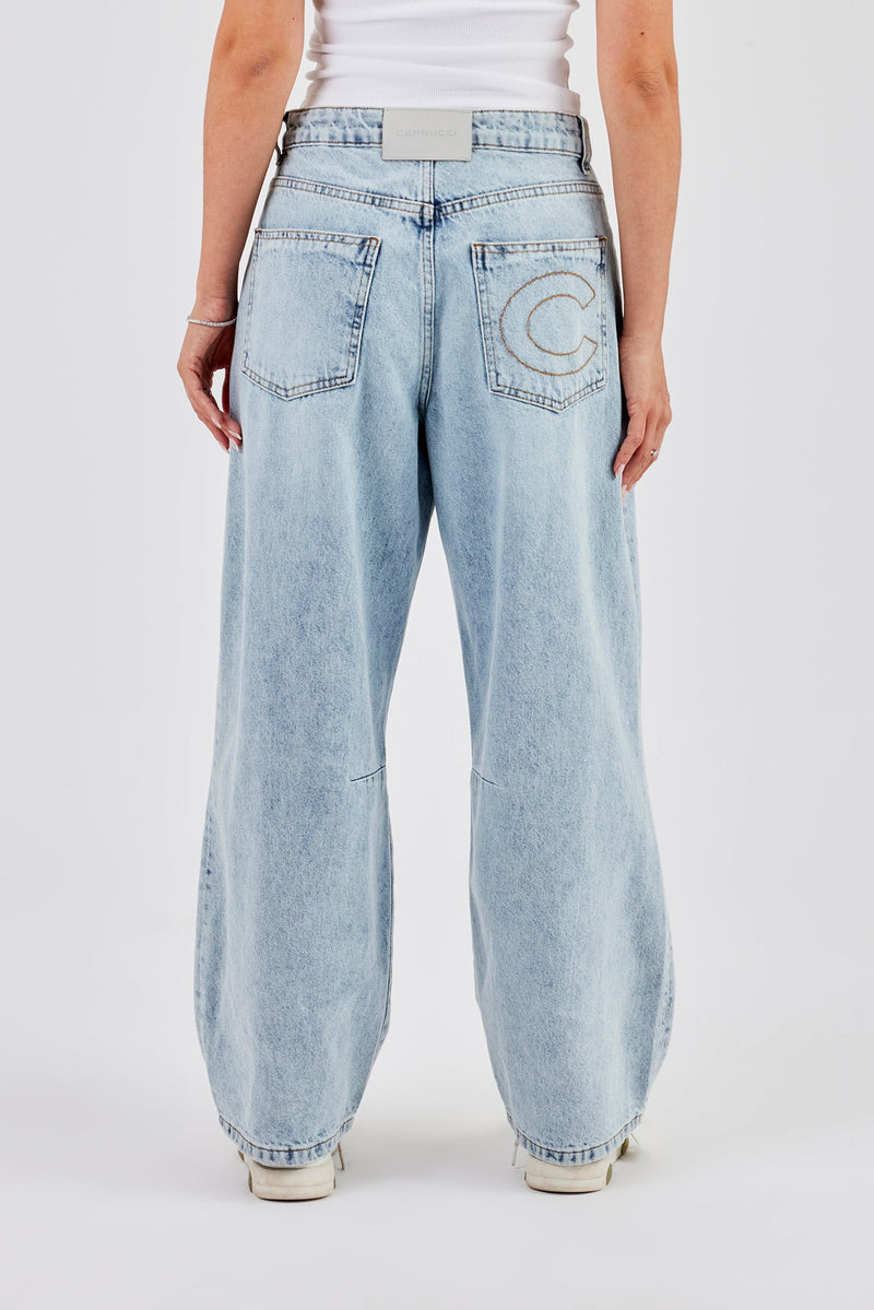 Light blue baggy balloon fit jeans in rigid cotton denim with branded trims.