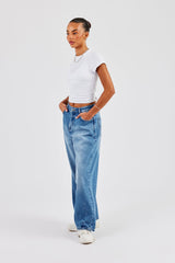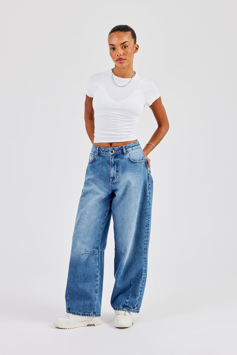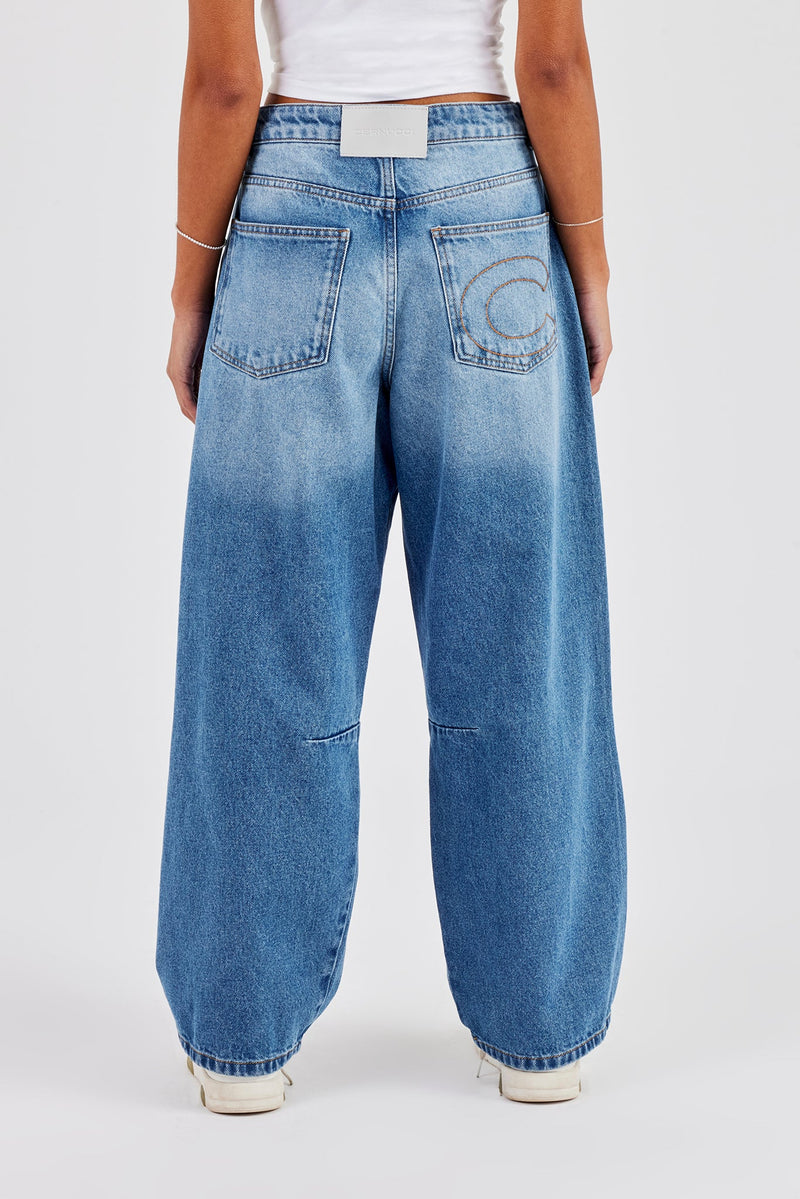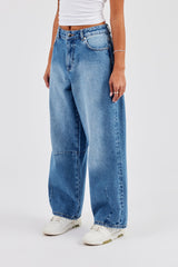 Mid blue baggy balloon fit jeans in rigid cotton denim with branded trims.