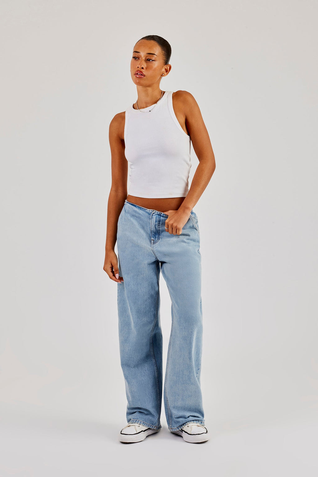 Bleach wash waistband detail, in rigid cotton denim. Baggy fit with, finished with branded trims.