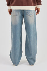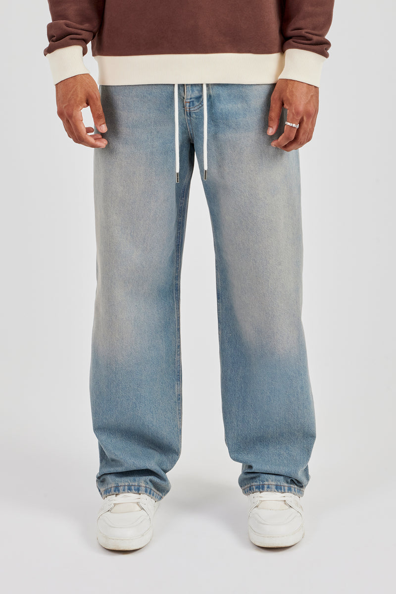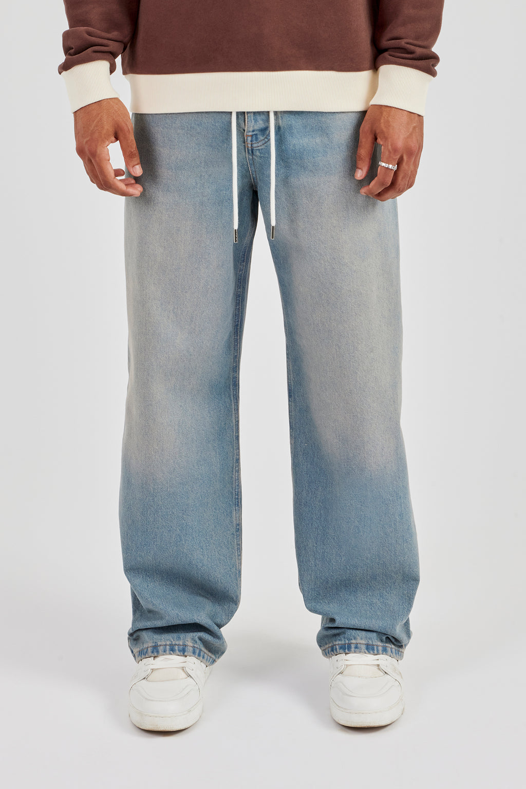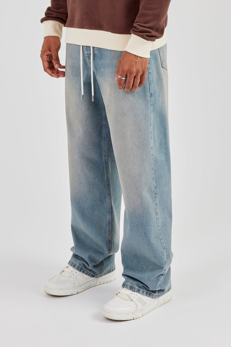 Antique wash jeans, in rigid cotton denim. Baggy fit with tie waistband detail.