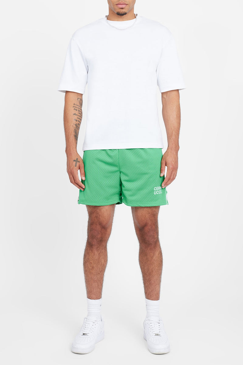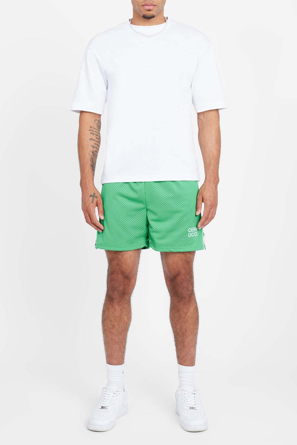 Green Cernucci embroidered tape shorts in a lightweight mesh.