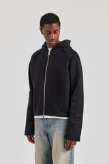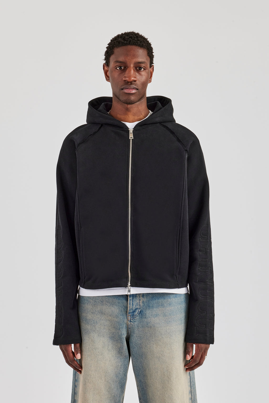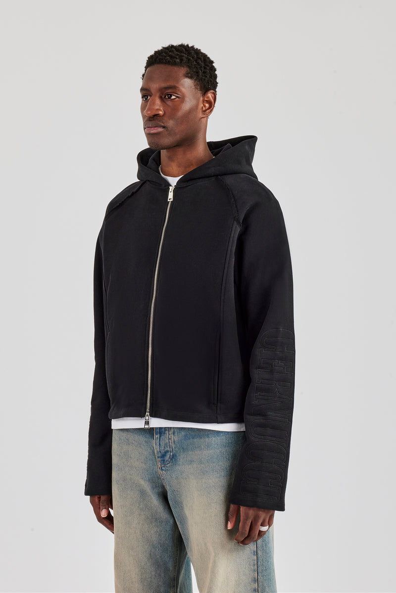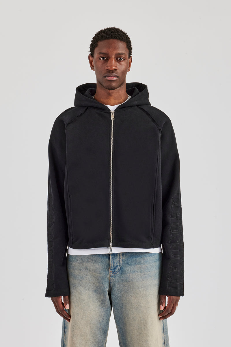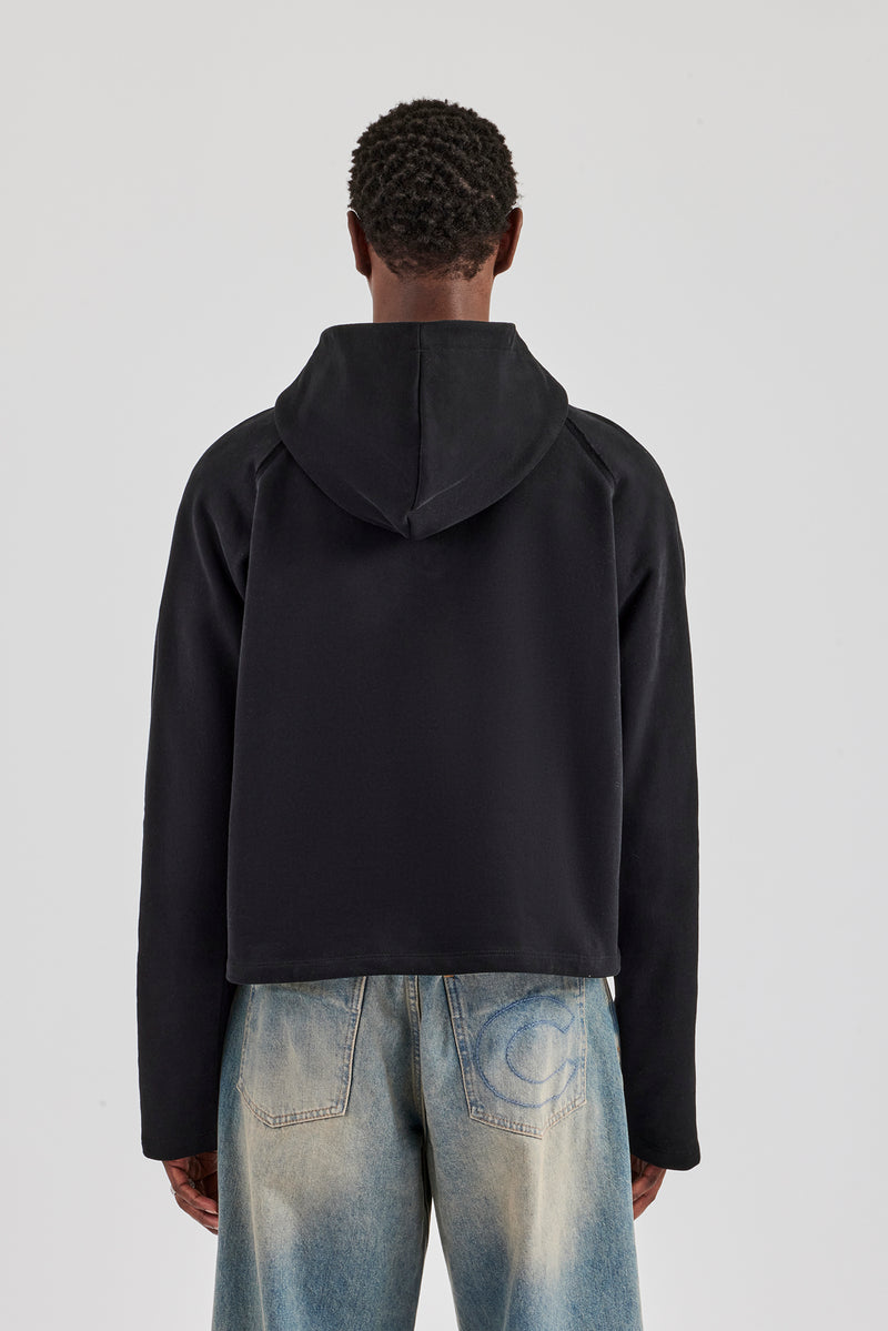 Black raglan hoodie with tonal sleeve embroidery in a medium weight, soft touch cotton.