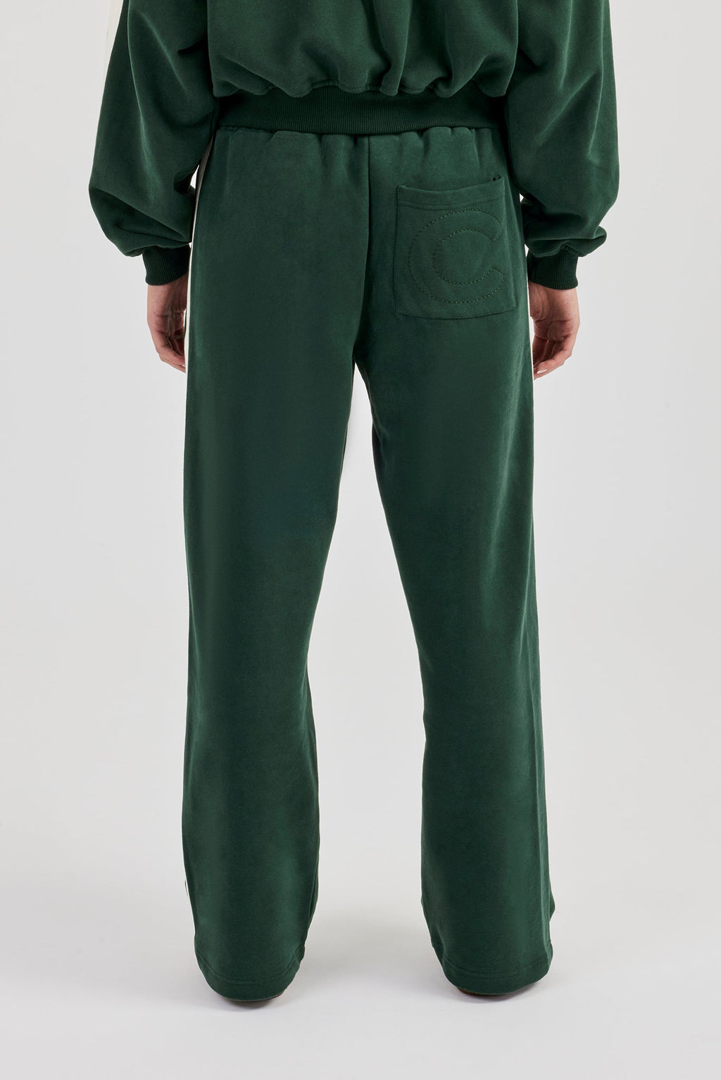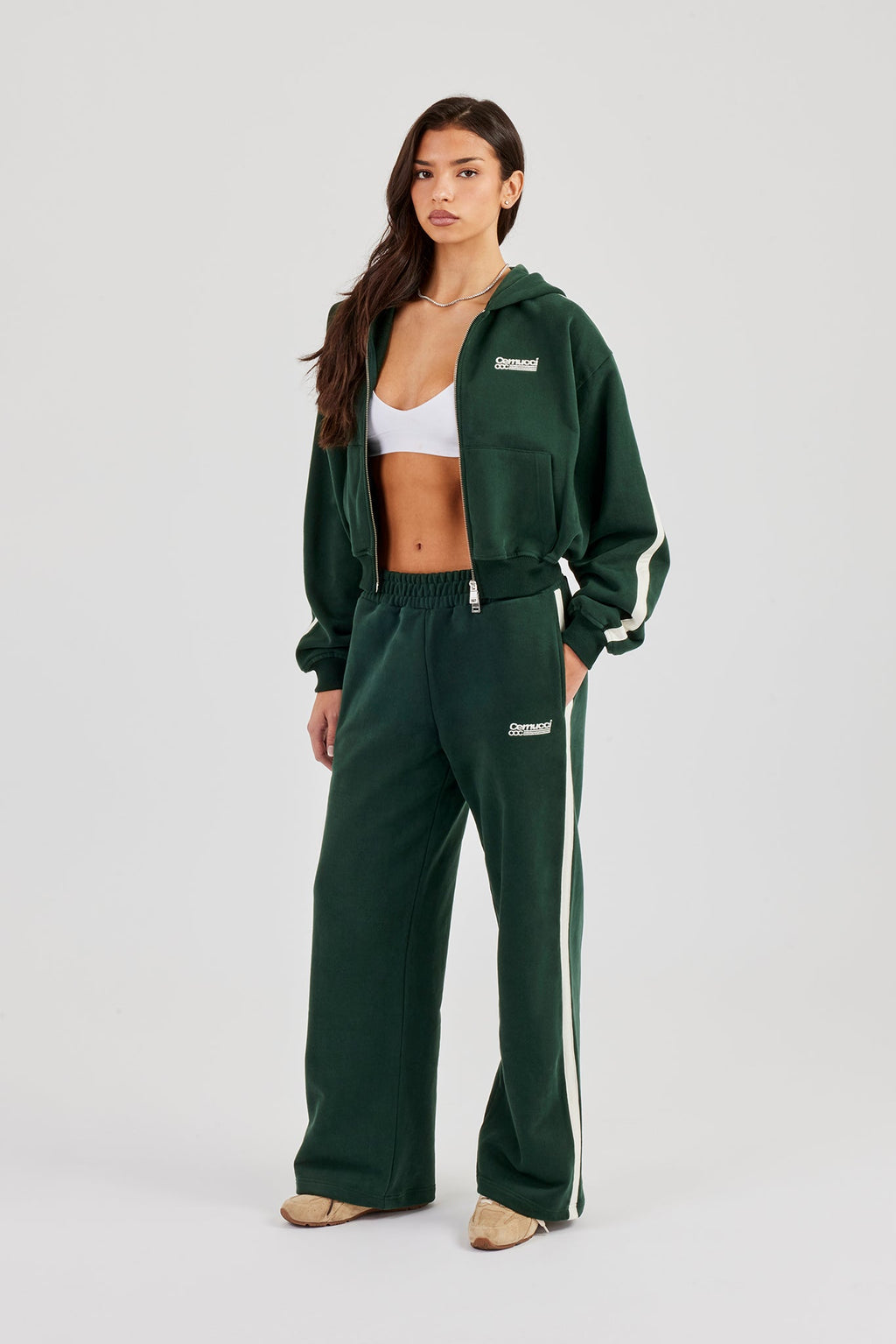 Forest green wide leg jogger. Premium heavyweight soft touch jersey with contrast side taping and embroidery.