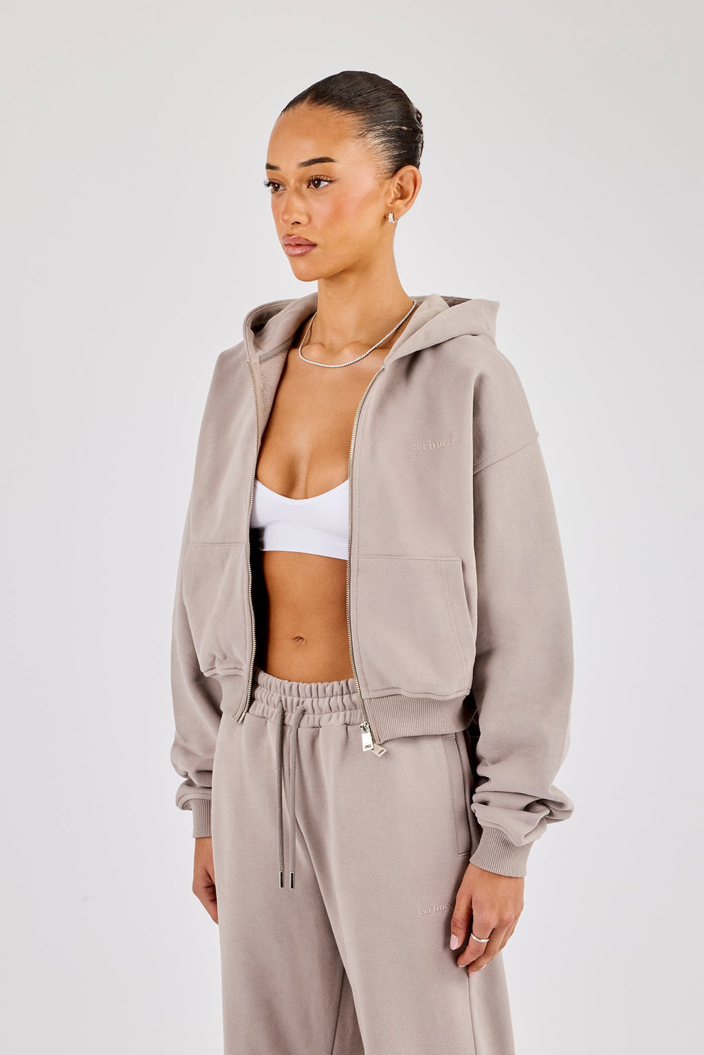 Cropped stone zip through hoodie. Premium heavyweight soft touch jersey. Pair with our matching joggers to complete the look.