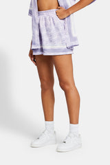 Purple repeat print short with a soft satin hand feel.
