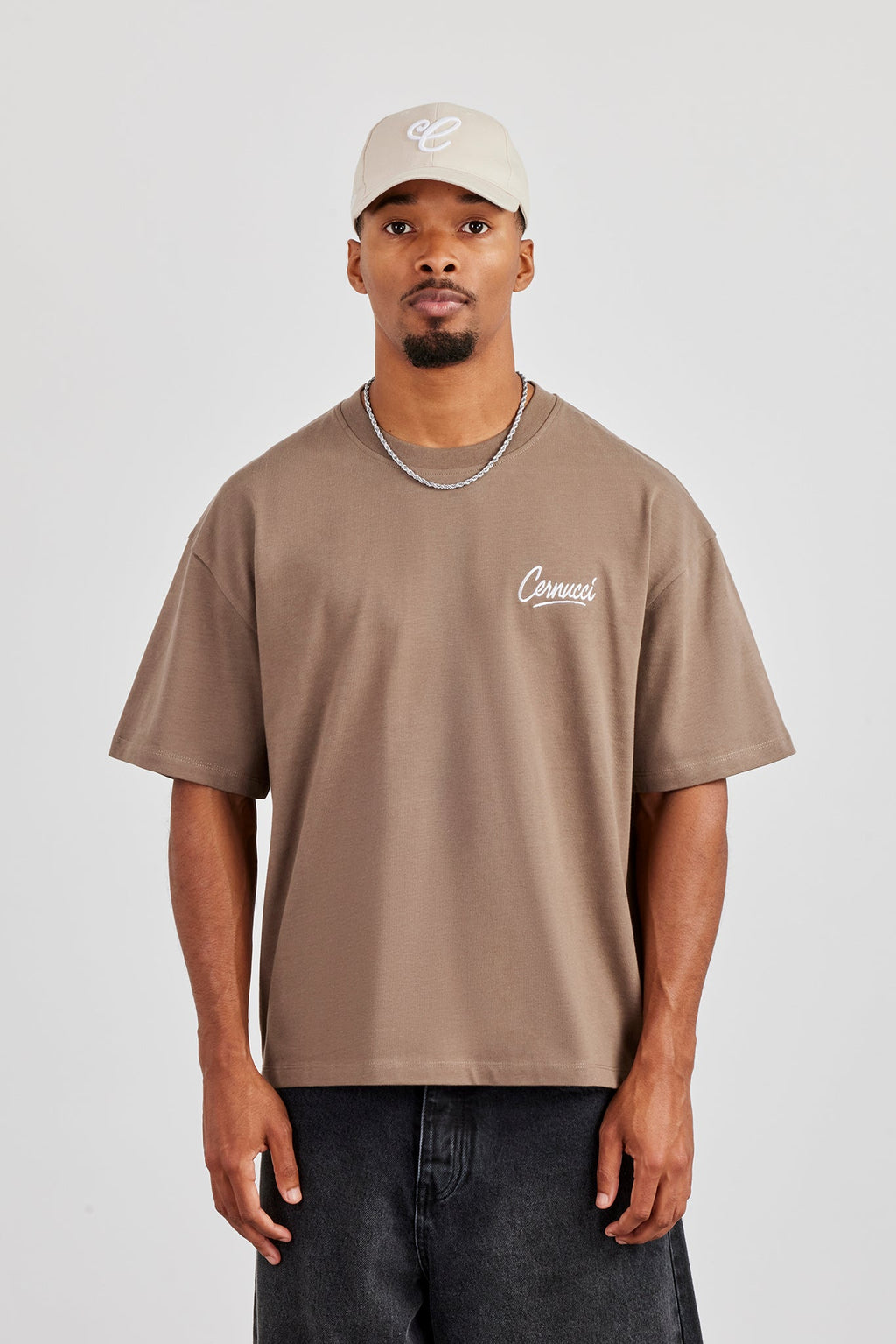 Taupe short sleeve t-shirt featuring back graphic print. Regular fit in a soft touch premium jersey fabric.