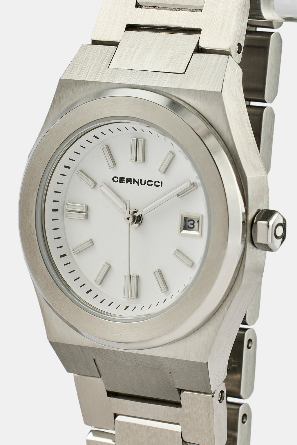 Polished bezel and strap with Cernucci branded white face, water resistant and embossed dial.