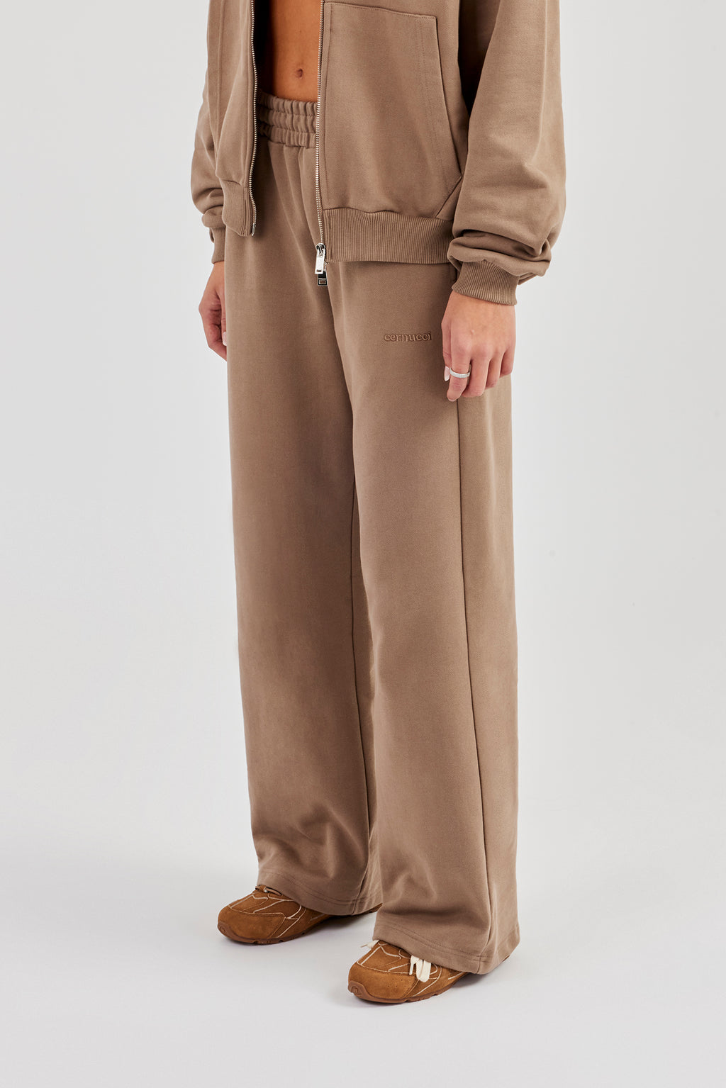 Taupe wide leg jogger. Premium soft touch jersey with Cernucci branded PU patch on centre back waistband.
