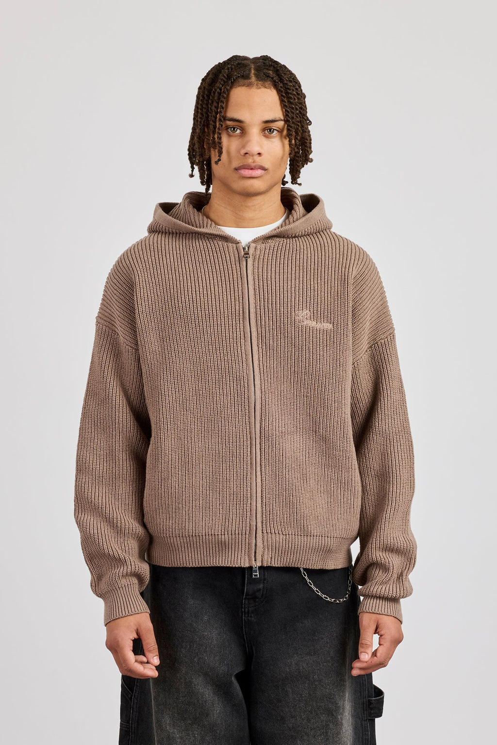 Taupe zip through hoodie in a soft touch knit with tonal stitch embroidery.