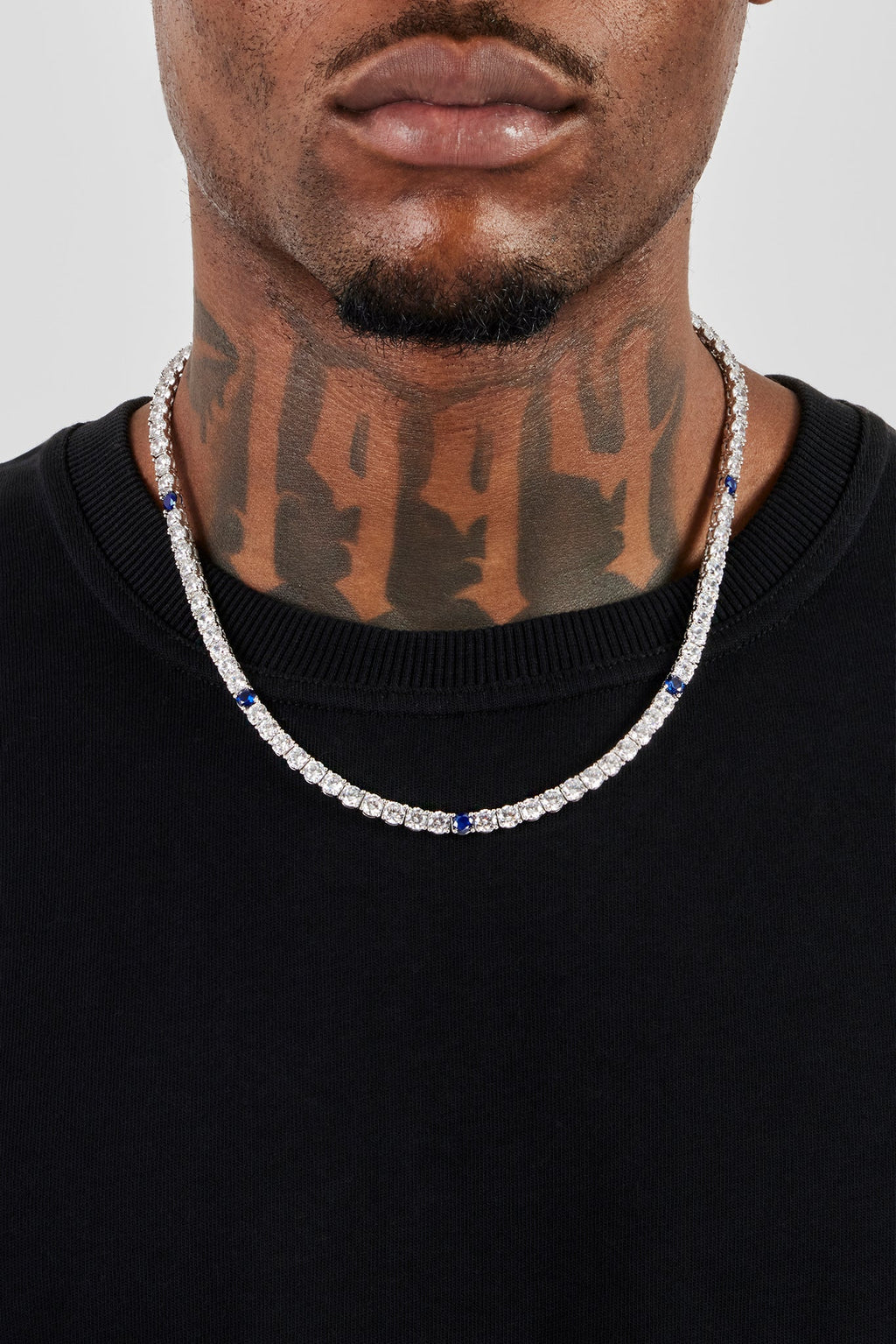 The Clear & Dark Blue Round Stone Tennis Chain brings contrast and shine in one clean piece. With alternating clear and deep blue stones, it’s a bold twist on the classic tennis chain, built to stand out.