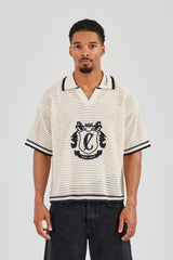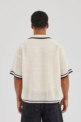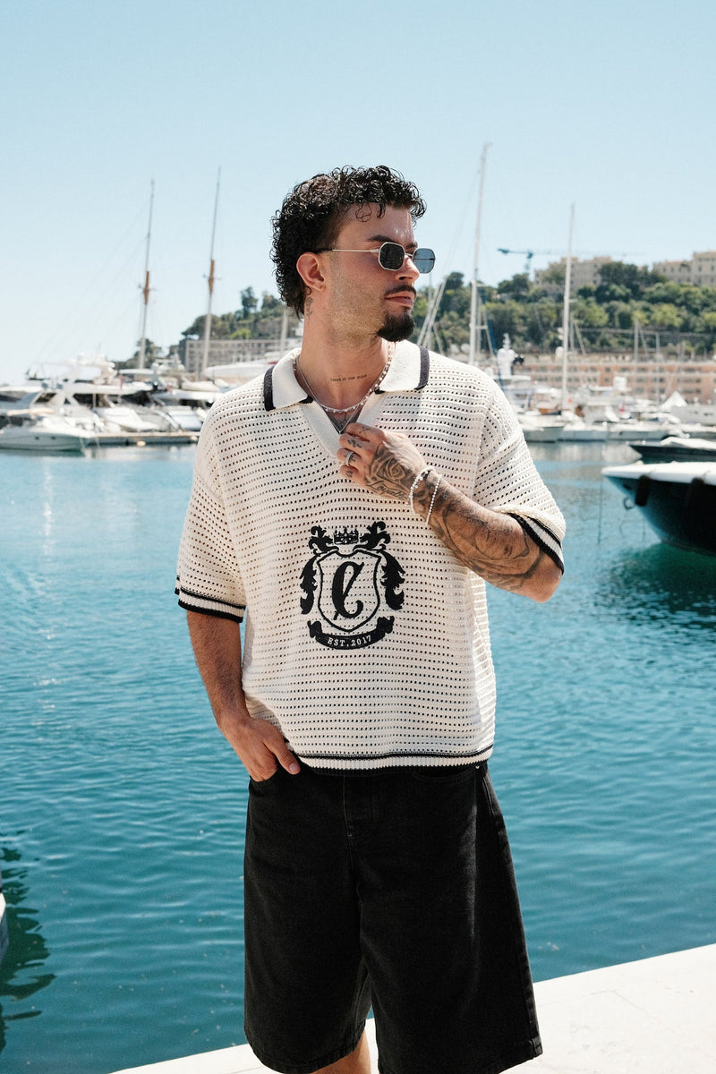 Knitted button polo with contrast rib featuring front embroidery. The ultimate summer staple. Pair with our denim or tailored jorts.