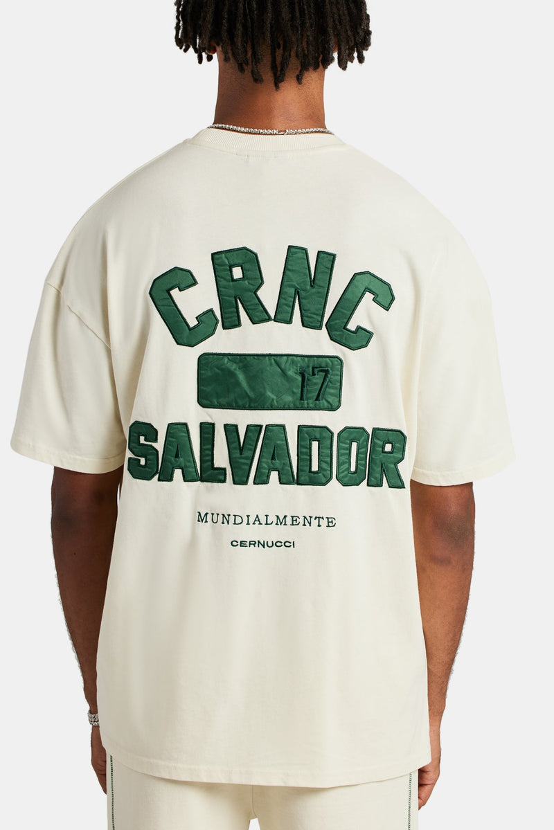 Ecru jersey t-shirt with varsity applique back print . Oversized fit in a medium weight cotton.