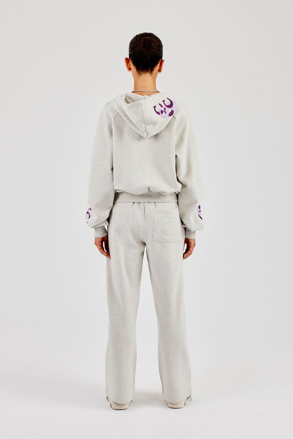 Ash gey wide leg jogger with layered applique branding. Premium soft touch jersey with Cernucci branded PU patch on centre back waistband.