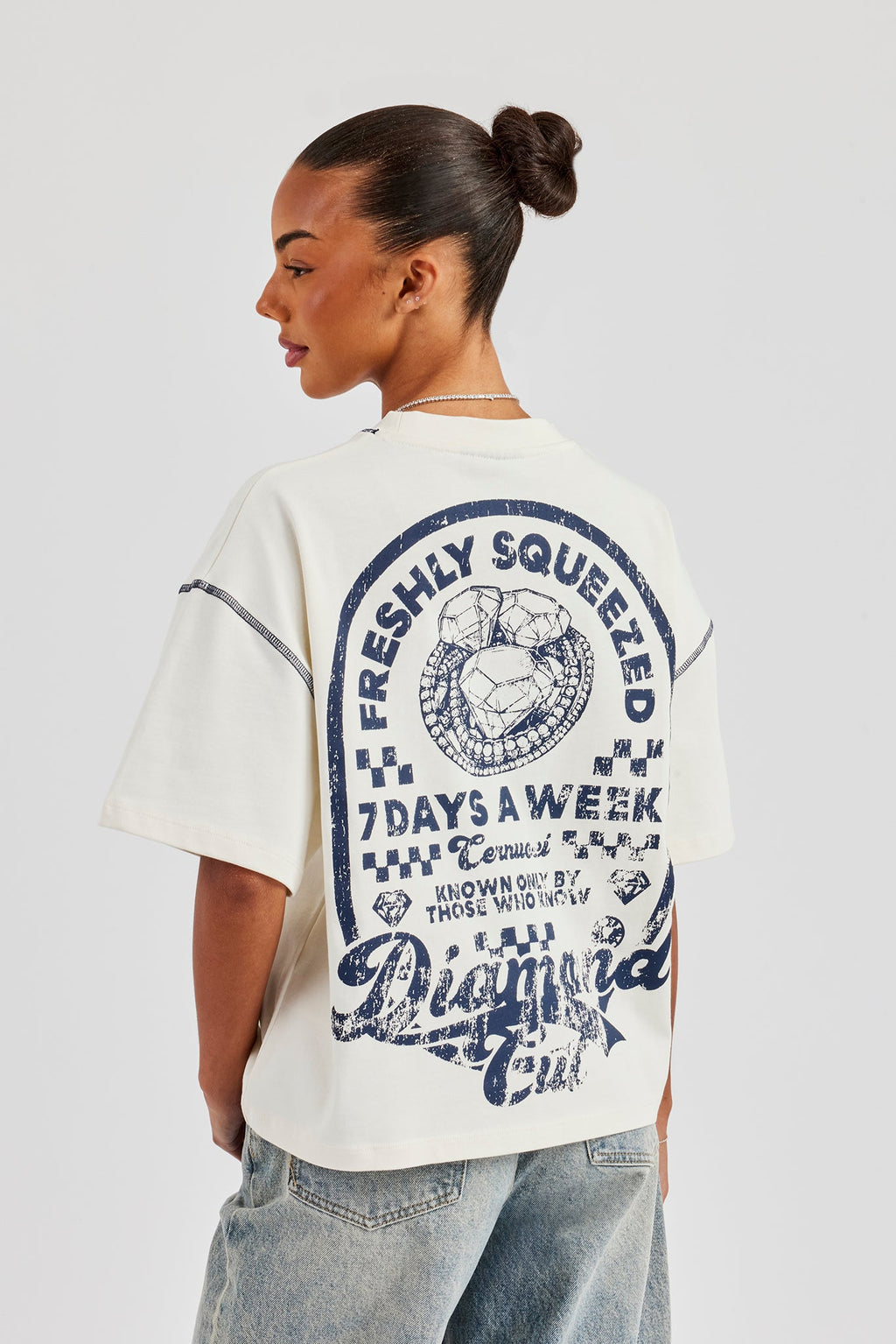 Diamond cut graphic print t-shirt with contrast stitch detailing, oversized boxy fit in a medium weight soft touch jersey