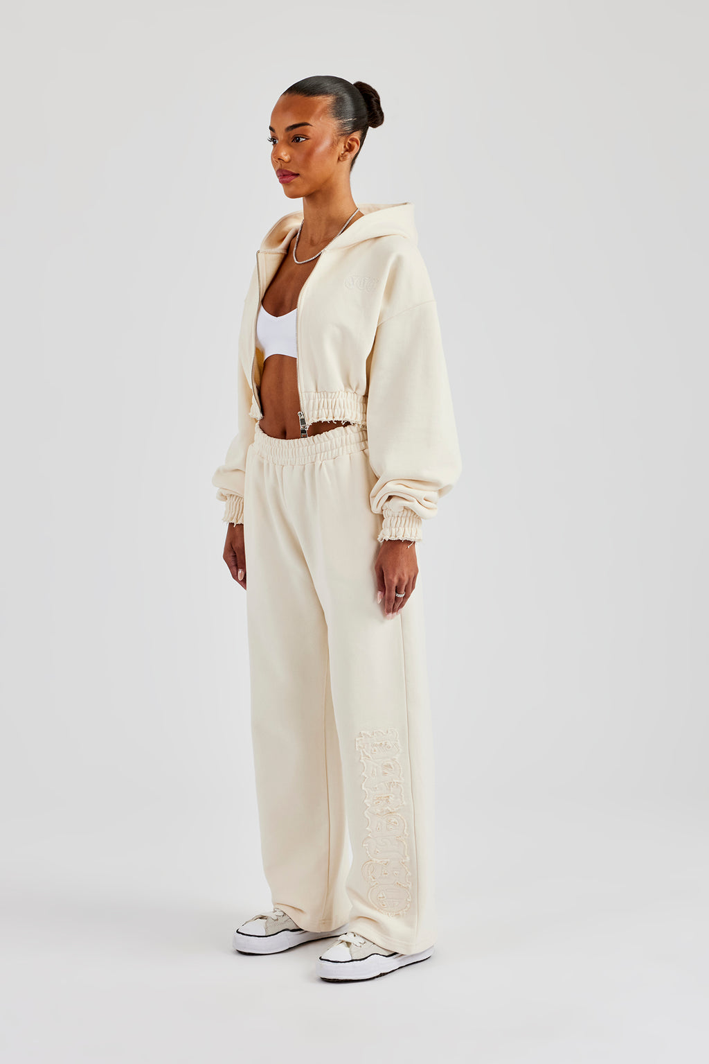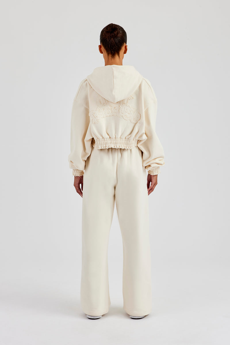 Butter yellow joggers in a wide fit finished with self fabric applique branding. Premium heavyweight soft touch jersey.