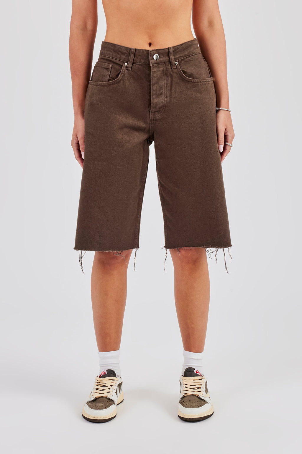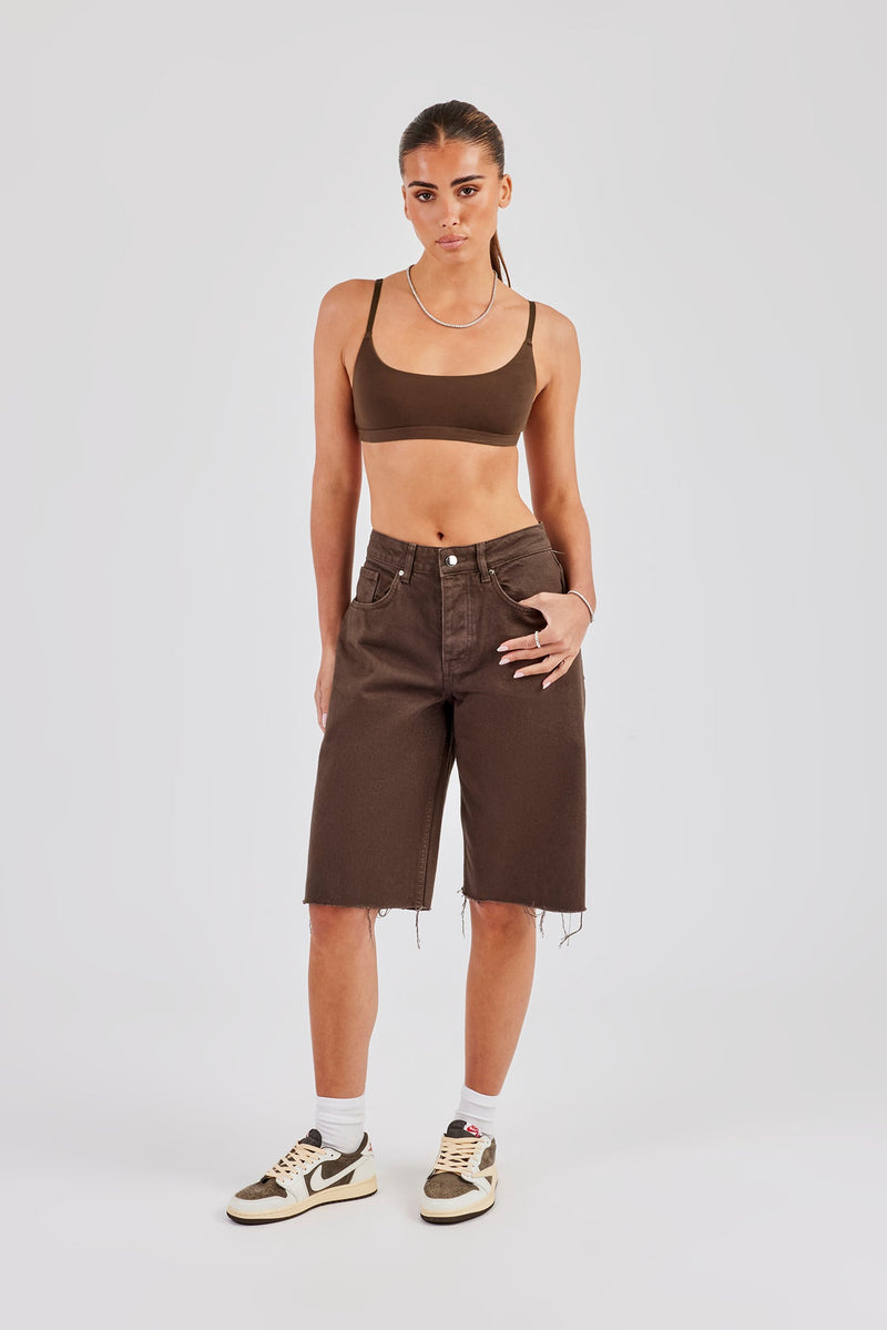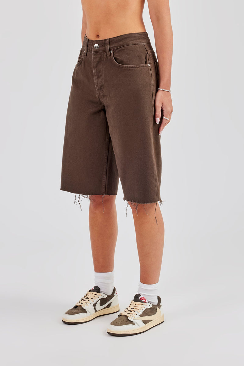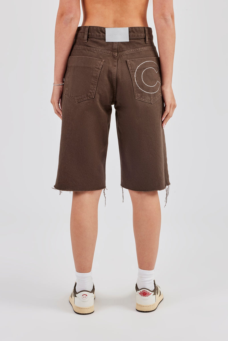 Chocolate denim jorts, in rigid cotton denim with embellished pocket detail.