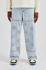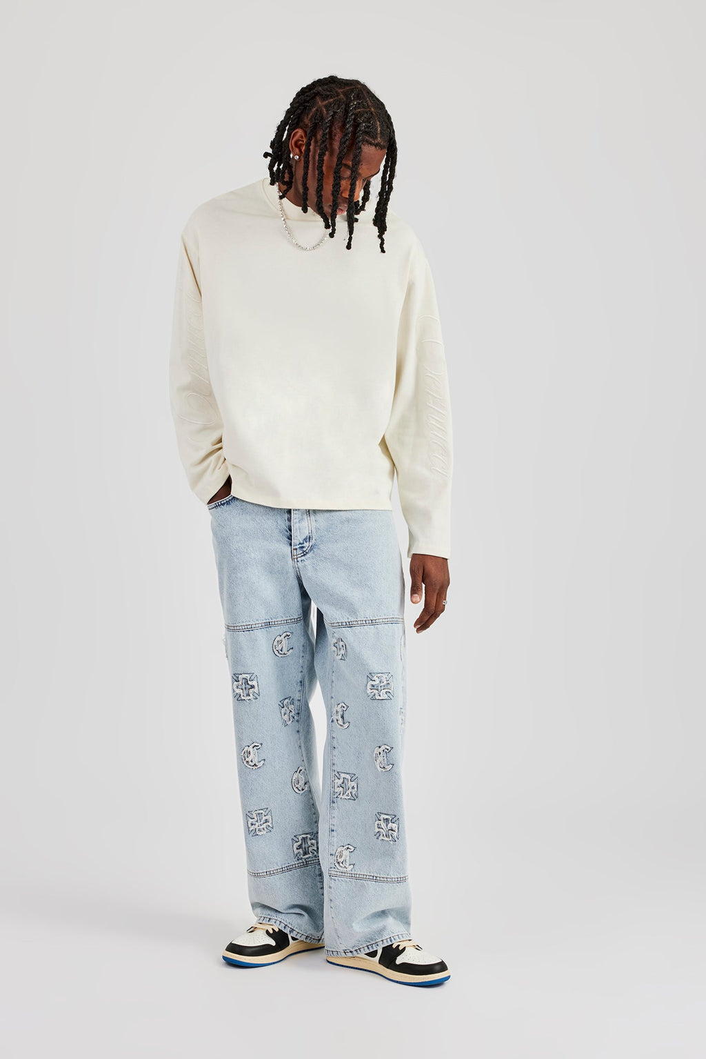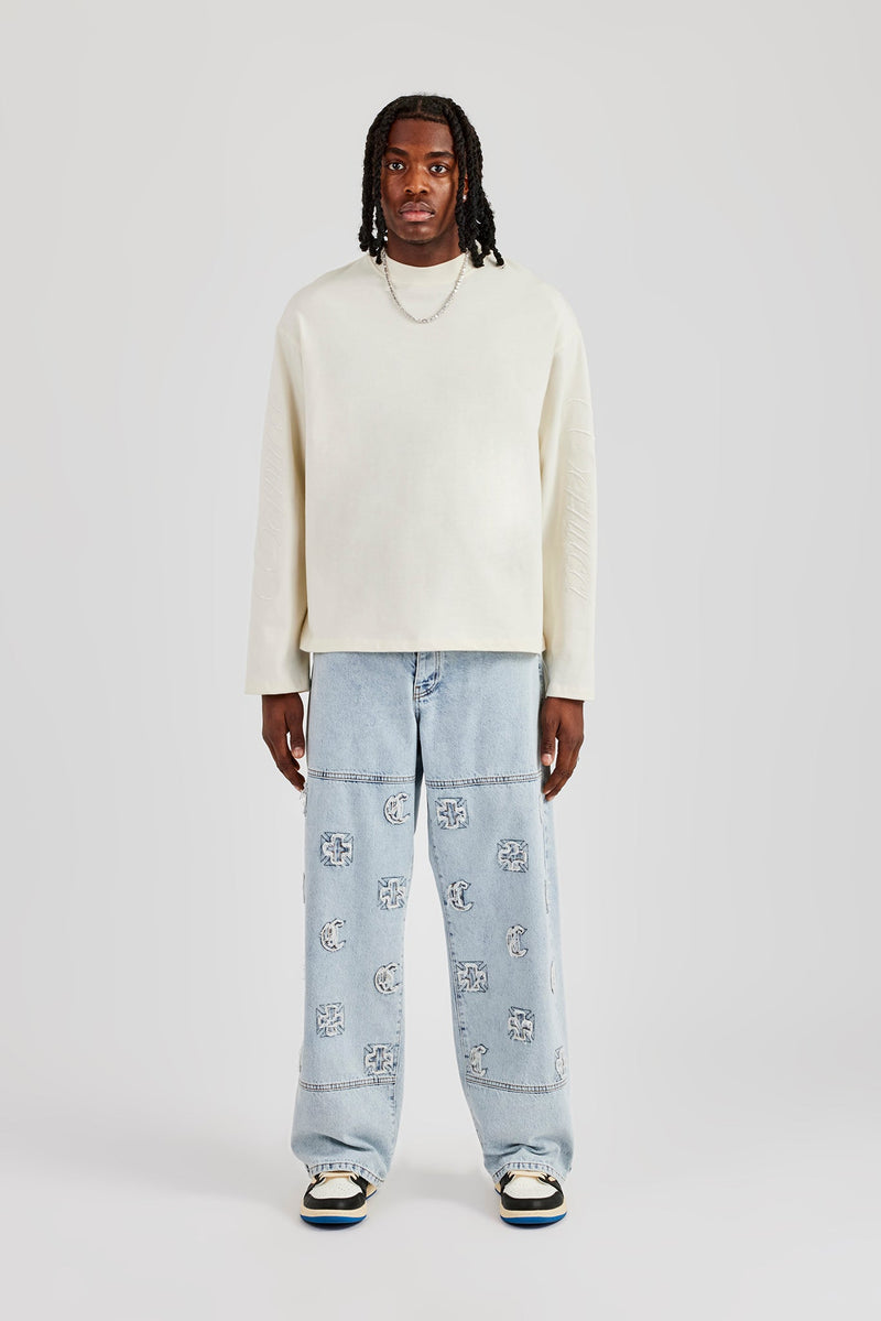 Light blue jeans in a rigid cotton denim. Baggy fit finished with raw edge applique detail.