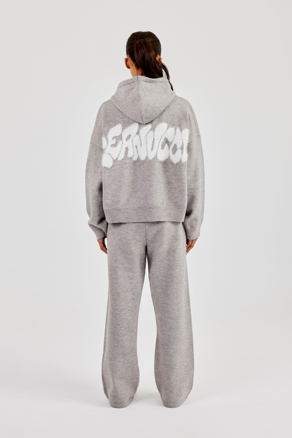 Grey wide leg jogger in a soft touch knit with intarsia C logo.