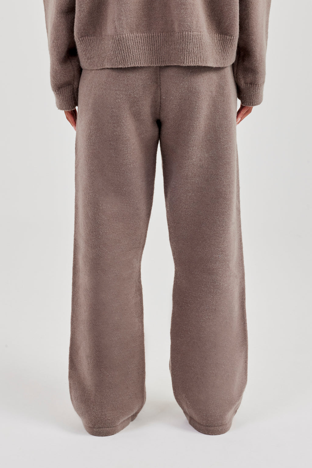 Taupe wide leg jogger in a soft touch knit with intarsia C logo.