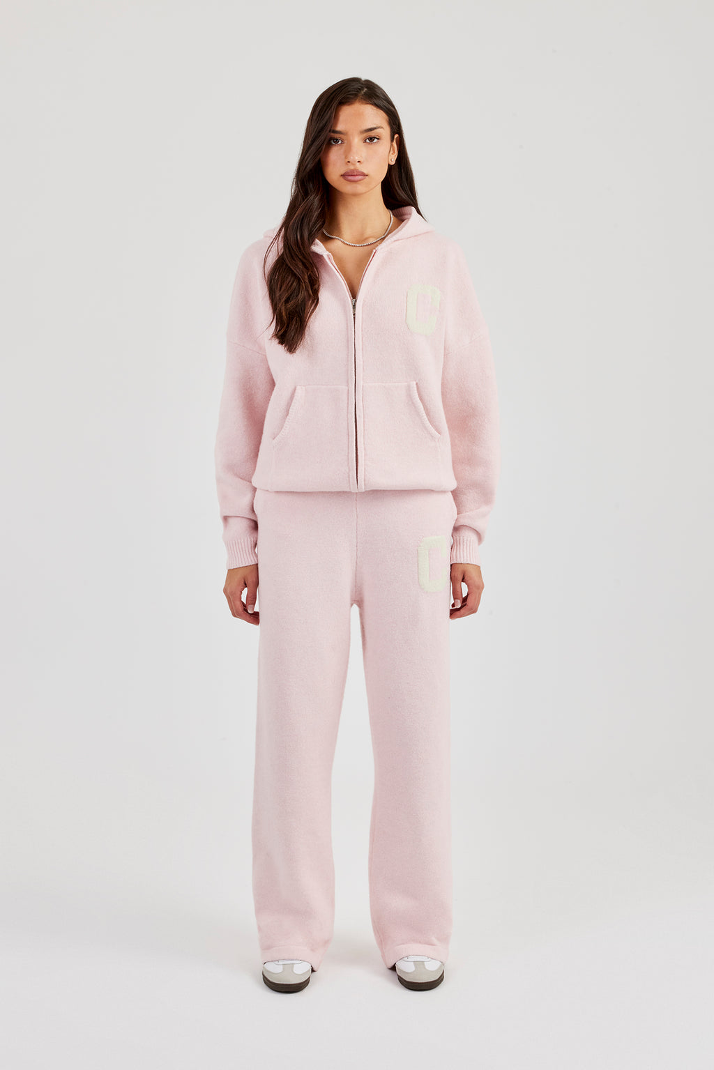 Baby pink zip Through Hoodie in a soft touch knit with jacquard C logo.
