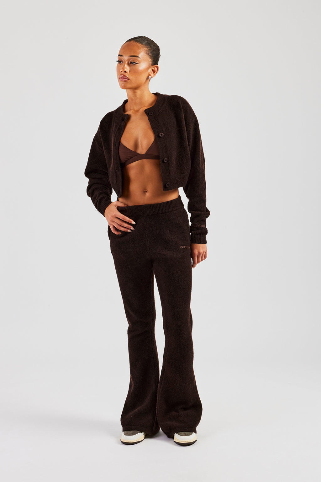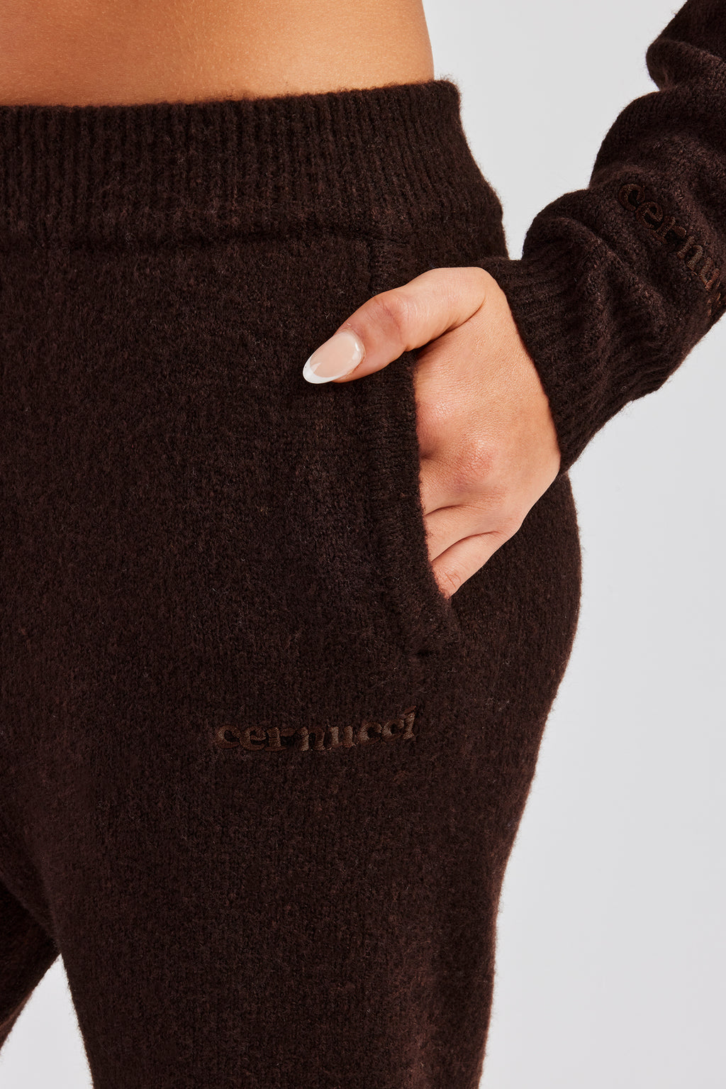Chocolate knitted flare in a soft touch knit with Cernucci branded tonal embroidery.