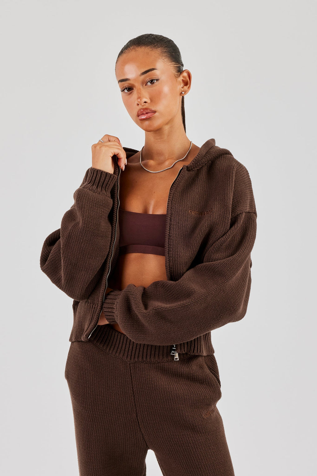 Chocolate zip through hoodie in a soft touch knit with tonal branded embroidery across the back.