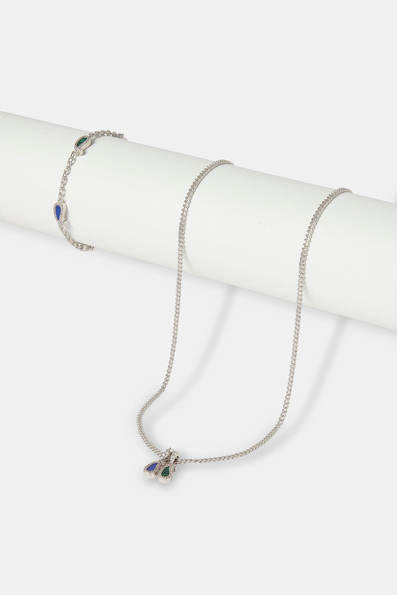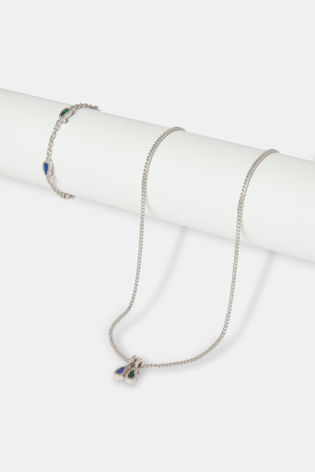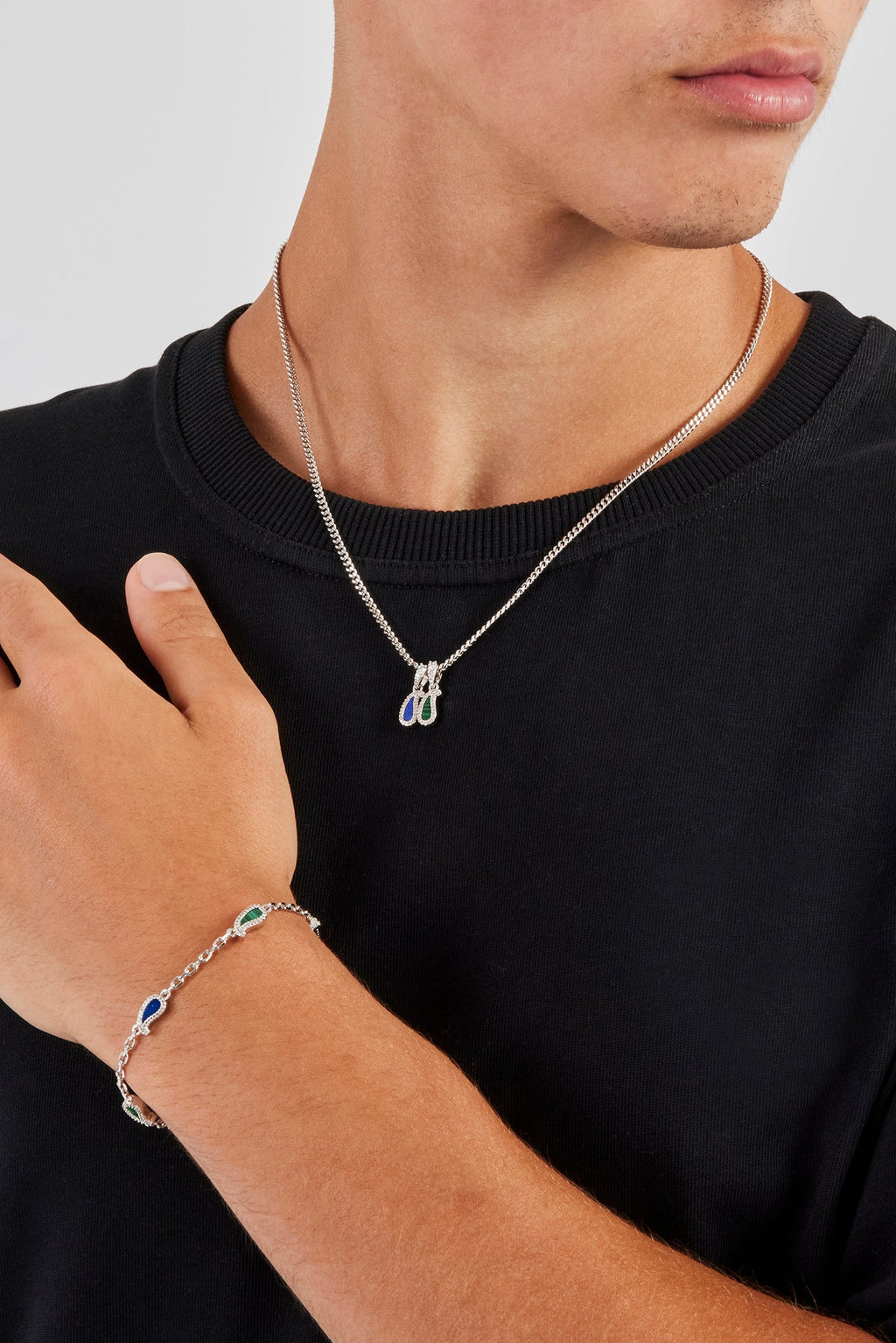 The Blue lapis meets rich green malachite, wrapped in fresh paisley patterns on sleek rolo chains. Stack the pieces or wear solo and flex different.