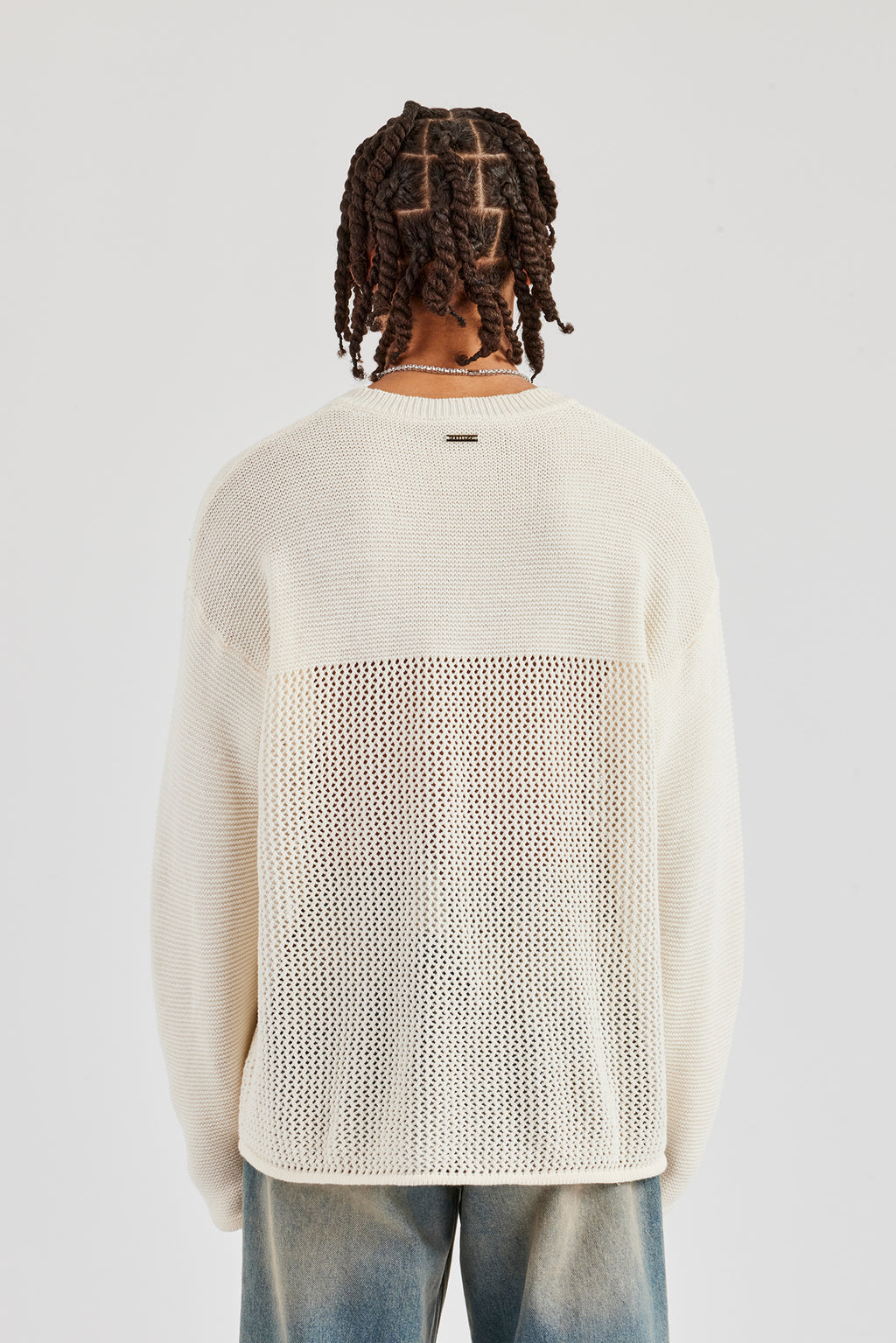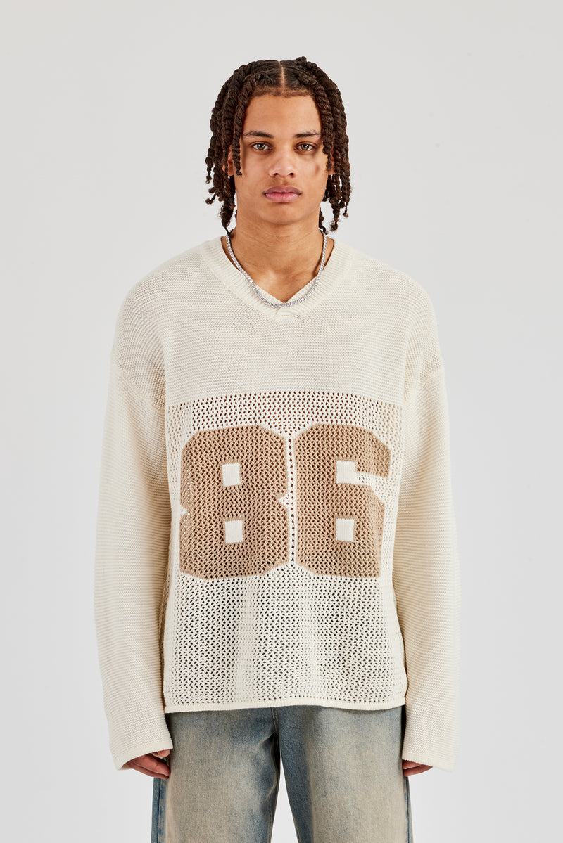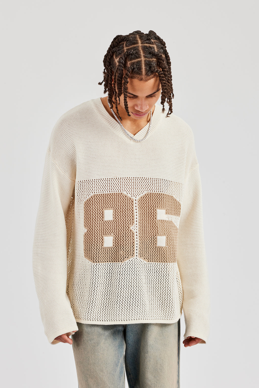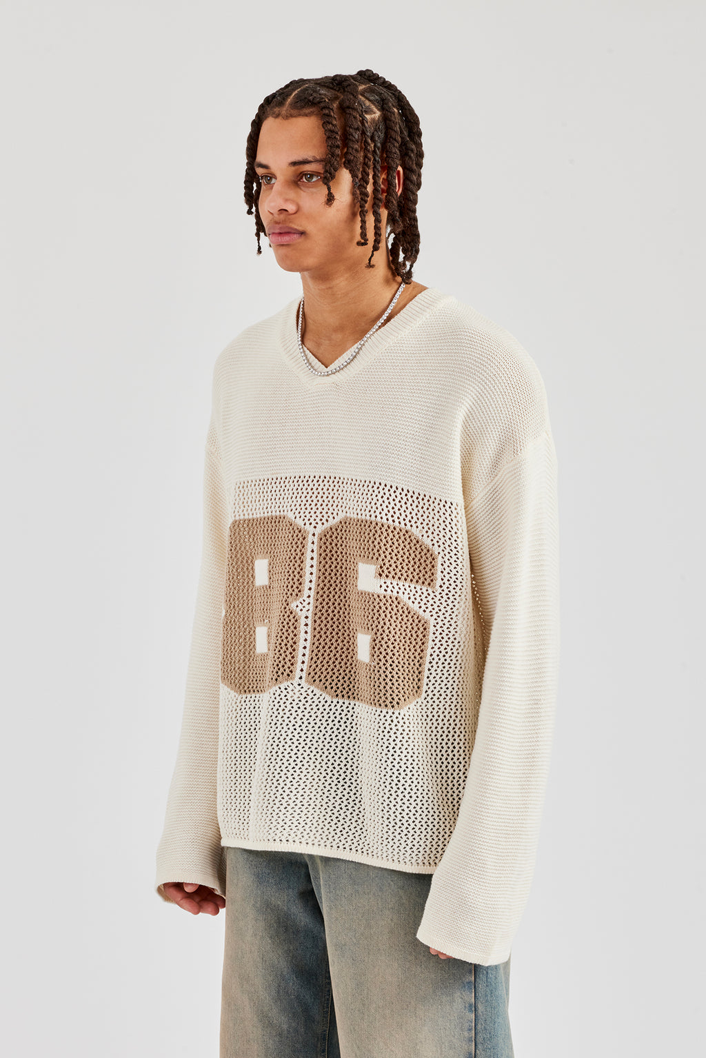 Our ecru knitted long sleeve varsity t-shirt with intarsia detail. Pair back with our bleach wash baggy denim jeans to complete the look.