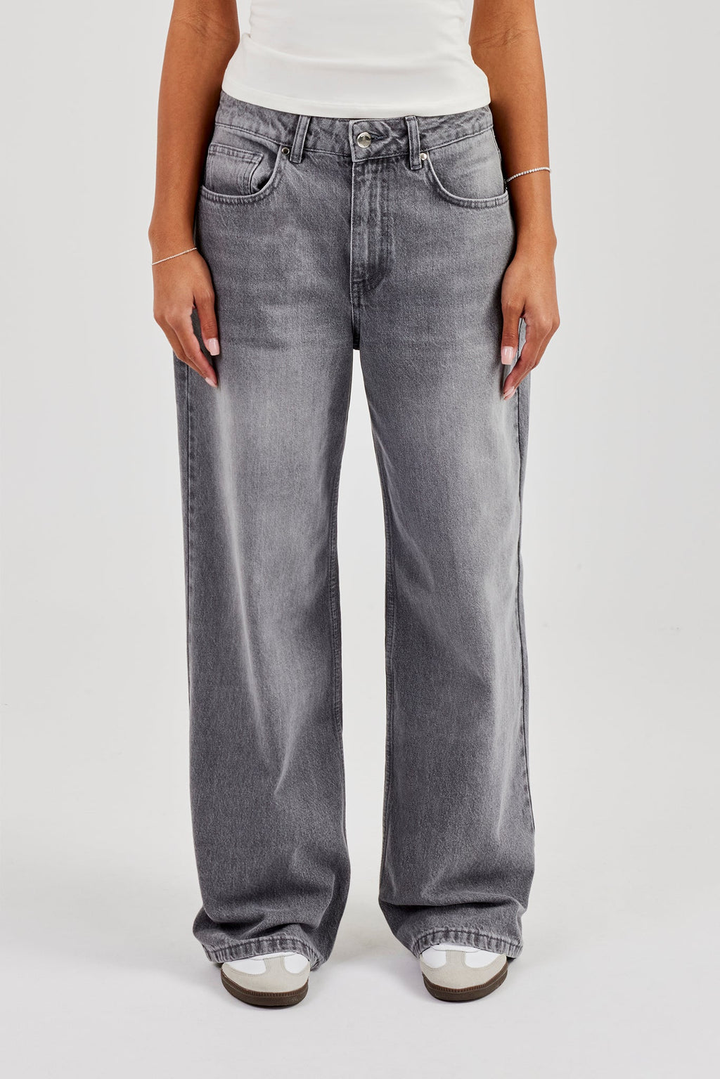 Washed grey jeans in a rigid cotton denim. Our new improved low rise baggy fit.