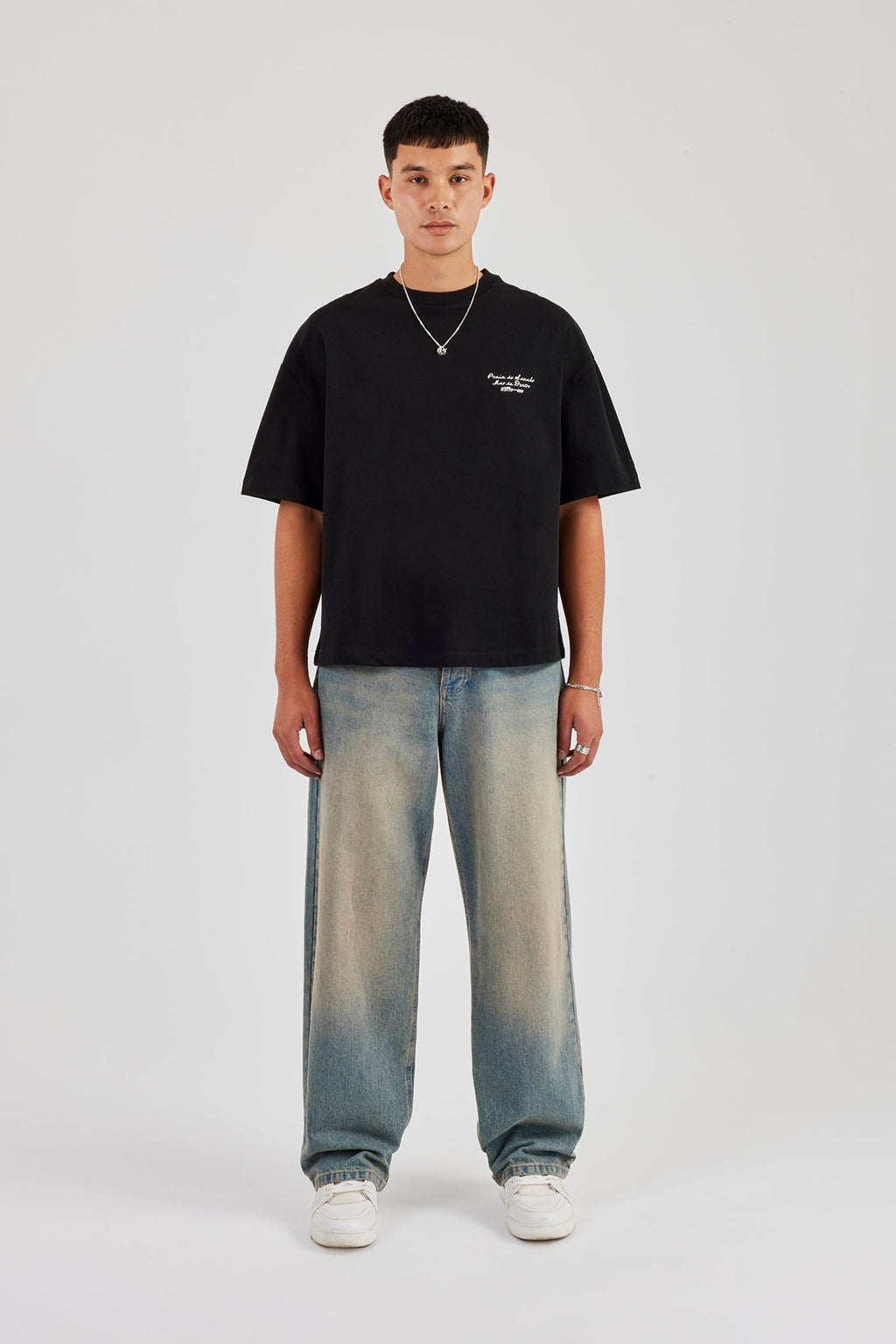 Black short sleeve t-shirt featuring back print. Boxy fit, dropped shoulders in a soft touch premium jersey.