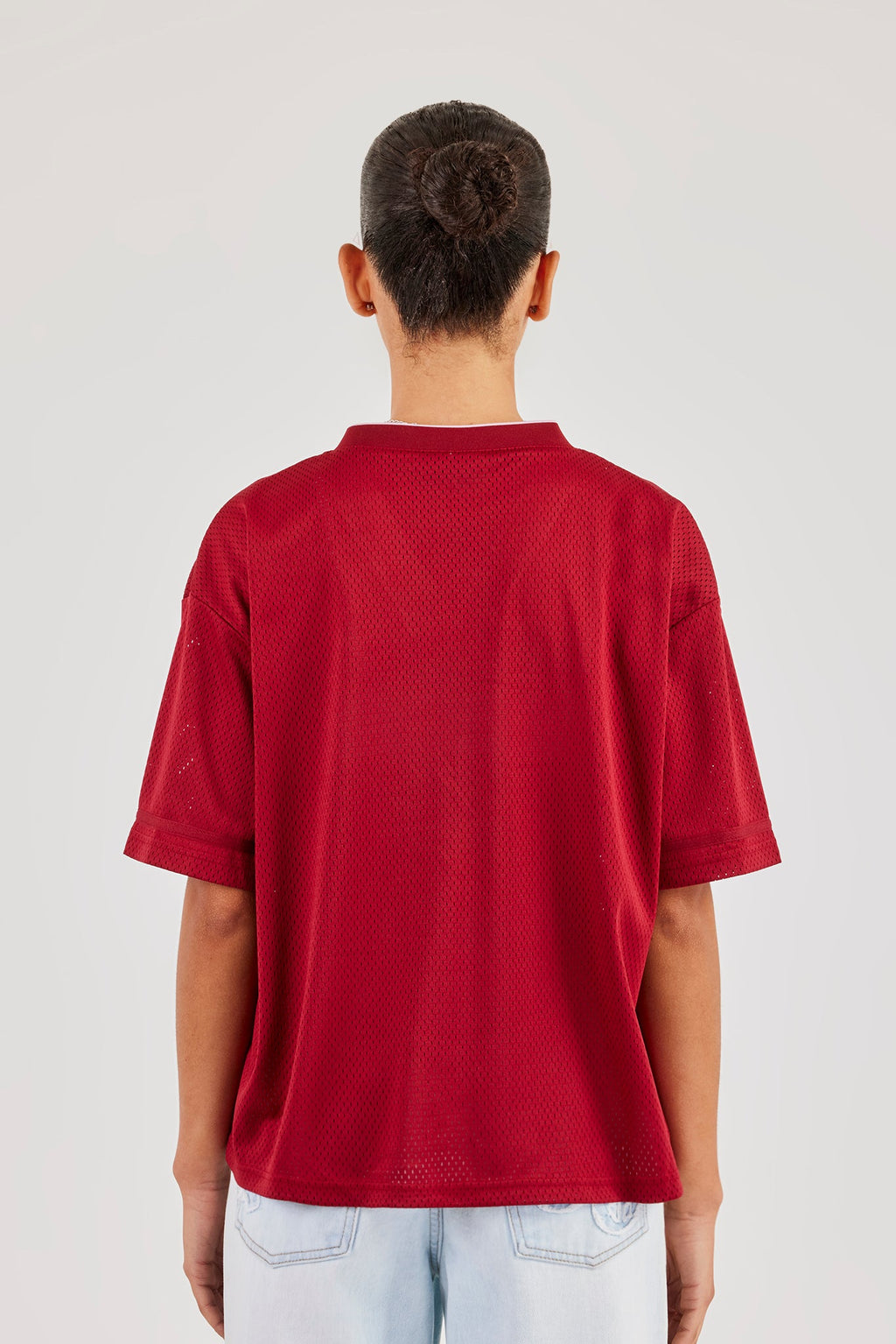 Mesh varsity top with graphic print in midweight mesh fabric.