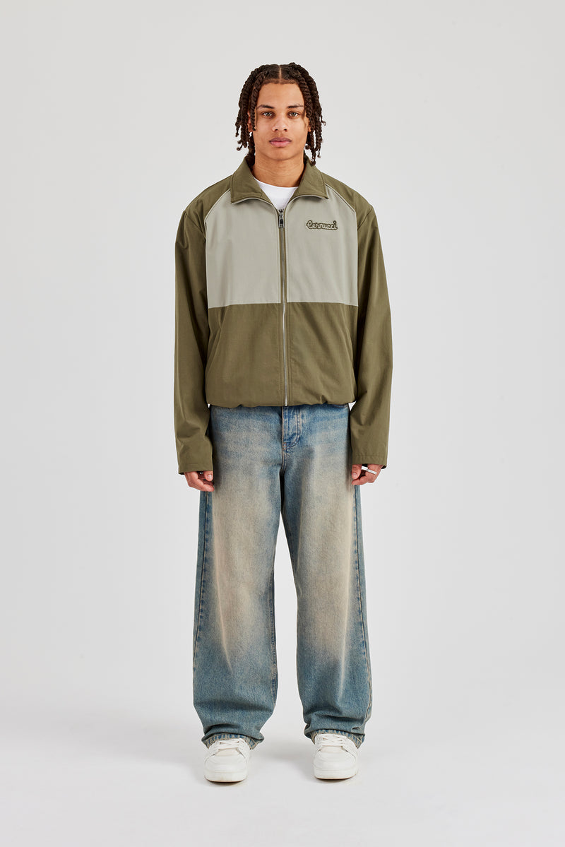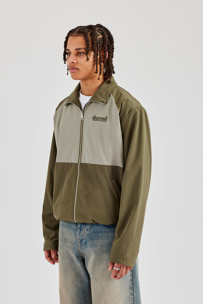 Funnel neck track jacket with contrast panel detailing in a lightweight nylon.