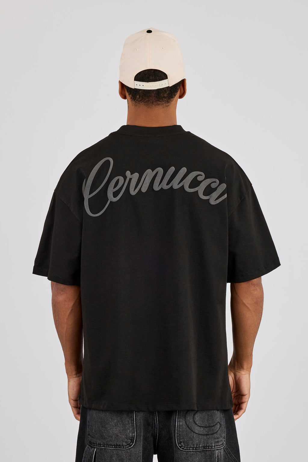 Oversized black t-shirt, featuring contrast Cernucci print, made from a medium weight soft touch jersey.