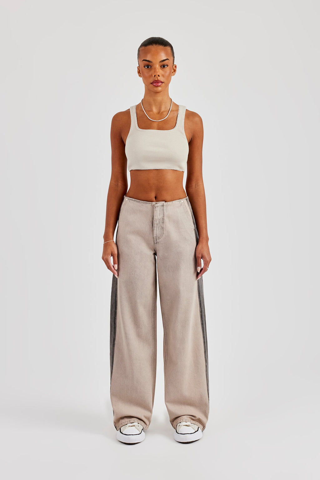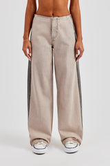 Washed stone jeans, in rigid cotton denim, featuring side panel and seam detailing. Baggy leg fit finished with branded trims.