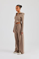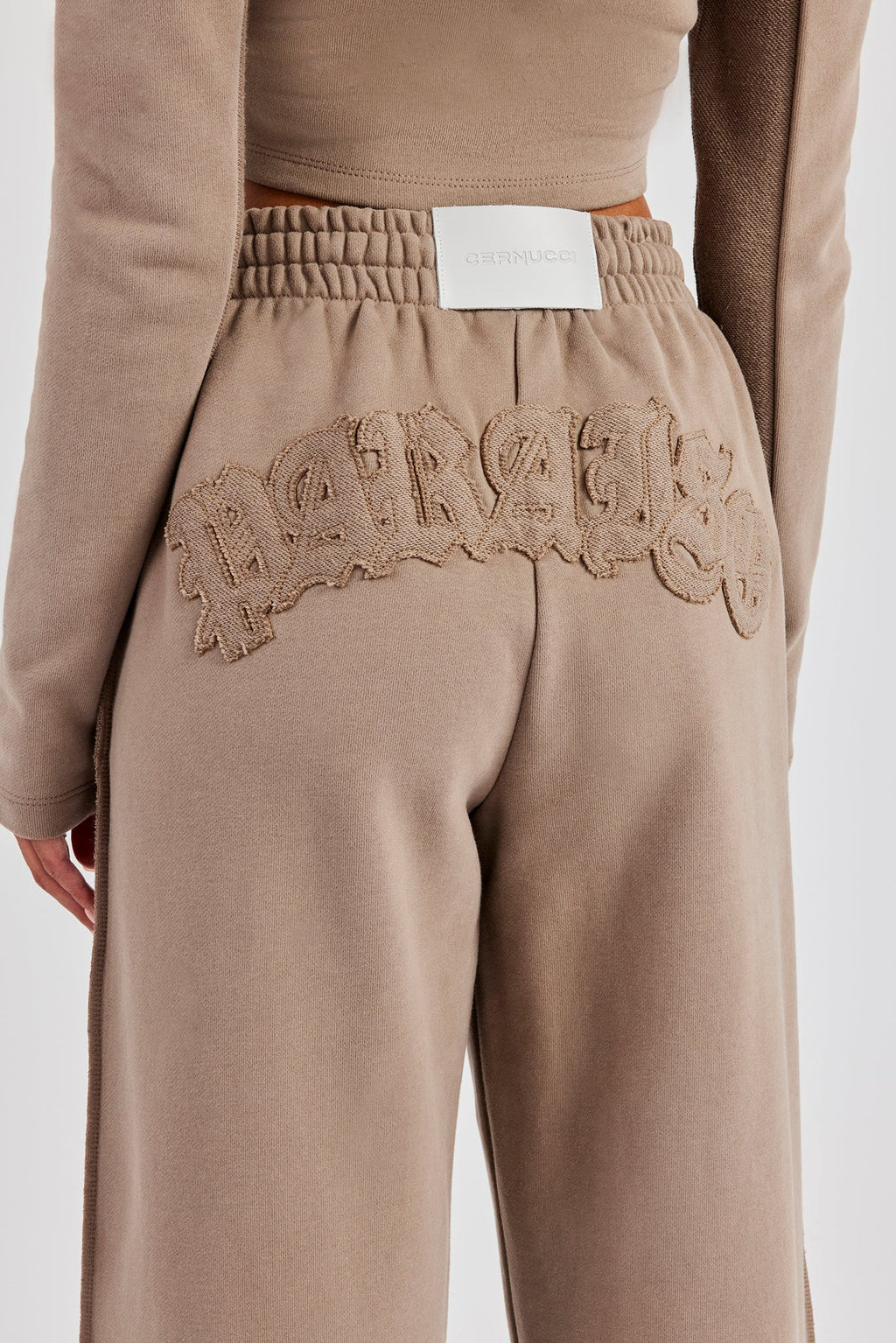 Taupe joggers in a wide fit finished with self fabric applique branding across the back. Premium heavyweight soft touch jersey.