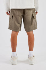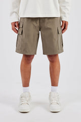 Khaki nylon cargo short in a relaxed fit, with utility pocket detailing