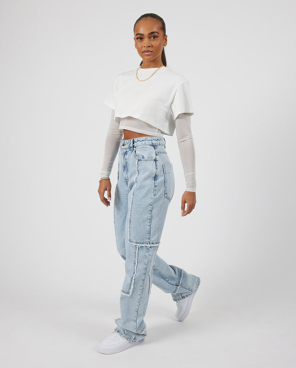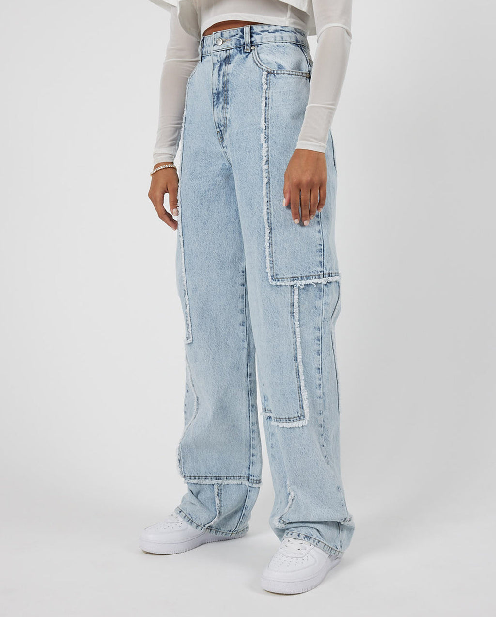 Ice blue washed jeans, in rigid cotton denim. Baggy fit finished with raw edge detail.