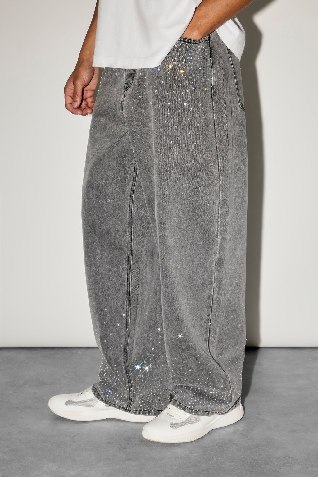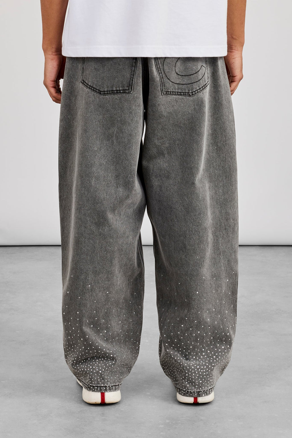Rhinestone detail jeans in washed grey. Super baggy fit in cotton rigid denim finished with branded trims.