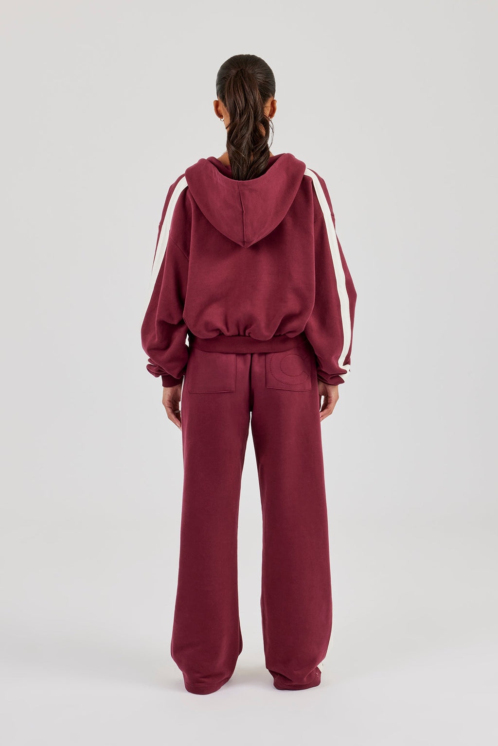 Burgundy, wide leg jogger. Premium heavyweight soft touch jersey with contrast side panelling and badge embroidery. Pair with our matching hoodie to complete the look.
