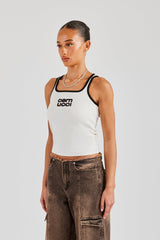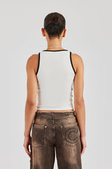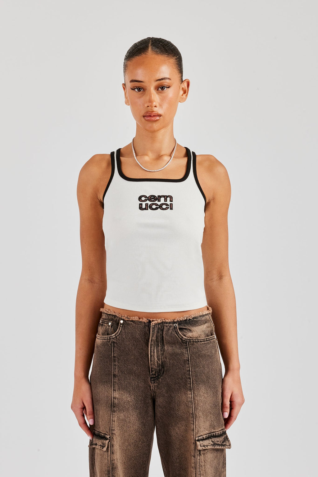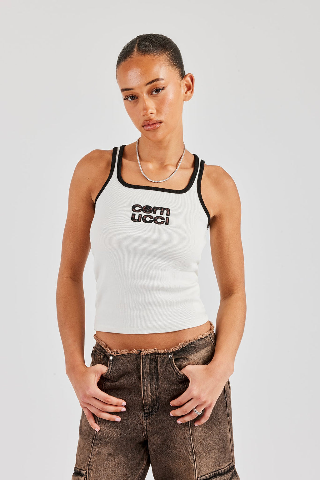 White rib square neck vest top in a lightweight rib jersey with leopard print Cernucci applique branding at centre front.