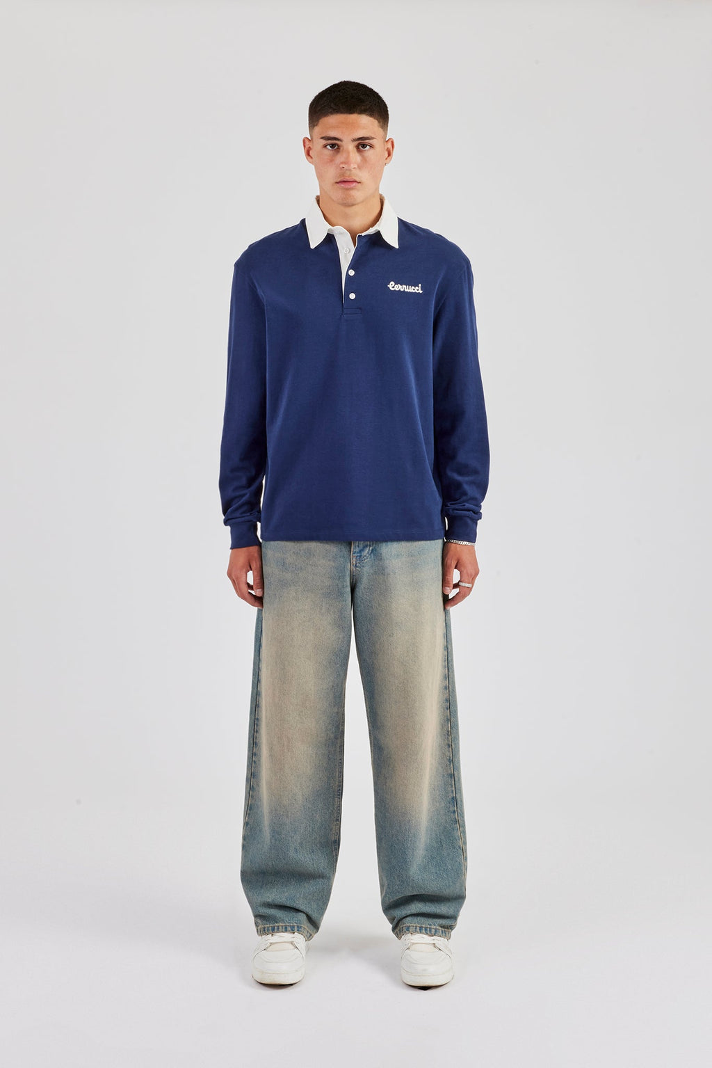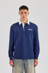 Long sleeve navy rugby polo with contrast collar & ribbed cuff.