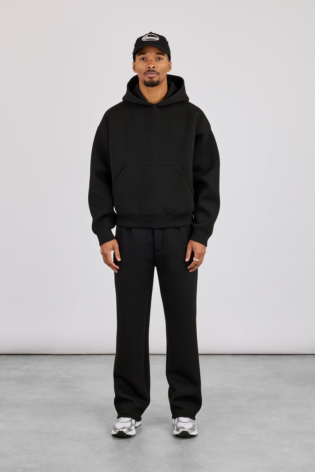 Black boxy scuba hoodie, made from soft touch premium scuba featuring. Pair with our matching trouser to complete the look.