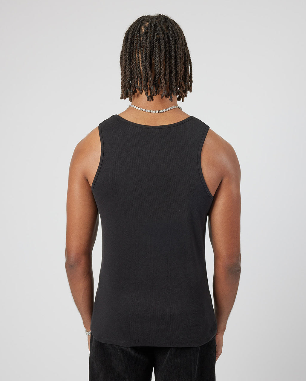 Classic black vest in a mid weight rib jersey fabric. The perfect layering piece or to be worn on its own.