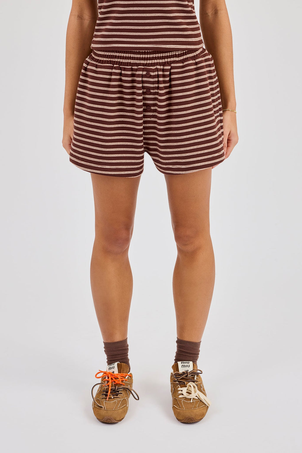 Soft touch striped shorts with button detailing. Pair with the matching soft touch top to complete the look.