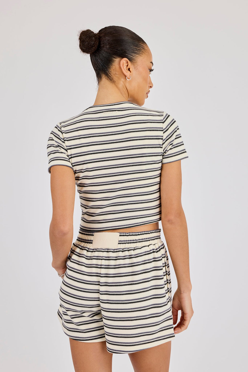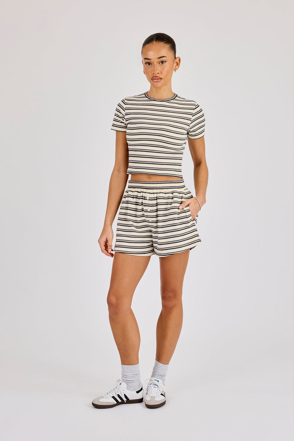 Soft touch striped shorts with button detailing. Pair with the matching soft touch top to complete the look.